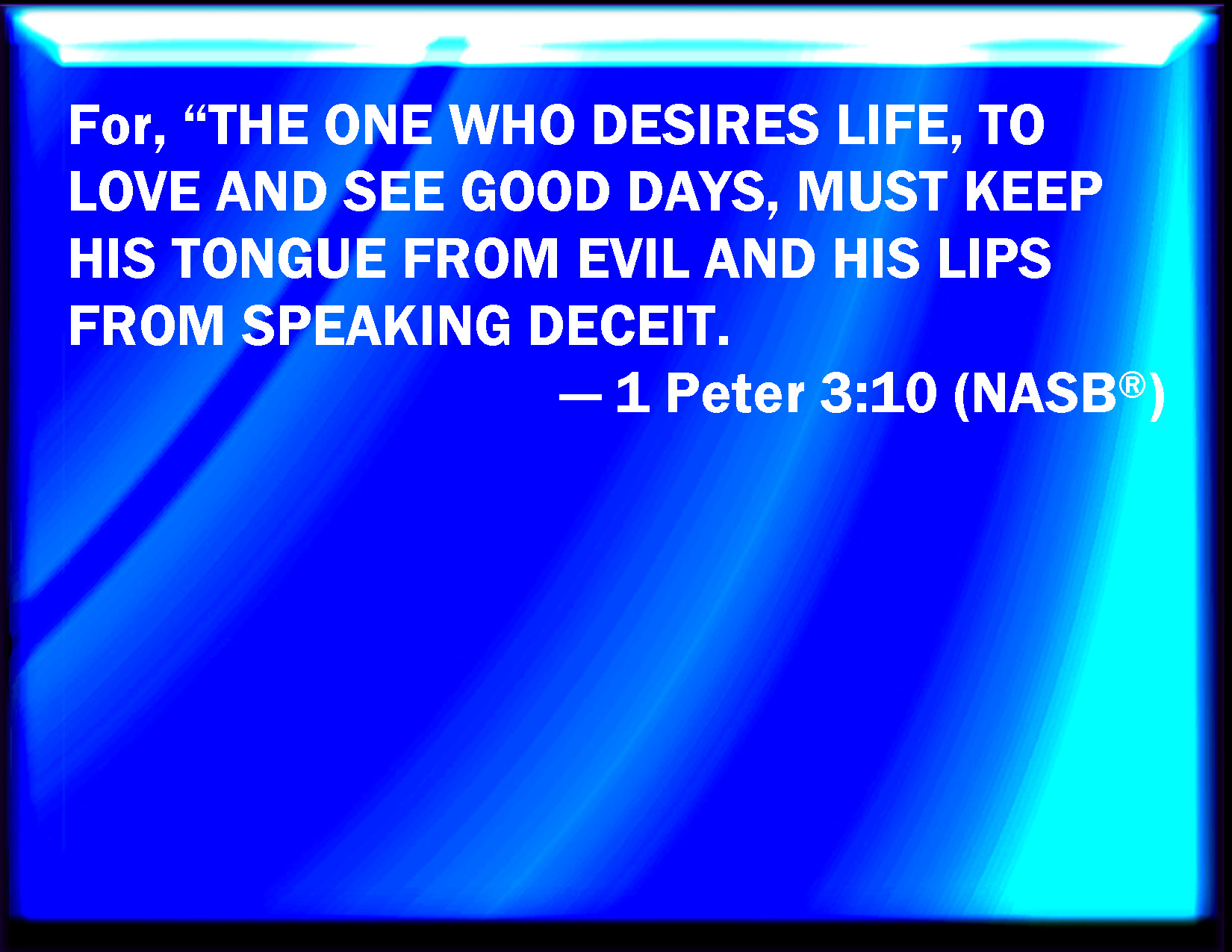 Bible Verse Slide 1 Peter 3:10 For he that will love life, and see good days, let him refrain his tongue from evil, and his lips that they speak no guile: KJV: For he that will love life, and see good days, let him refrain his tongue from evil, and his lips that they speak no guile: DRB: For he that will love life, and see good days, let him refrain his tongue from evil, and his lips that they speak no guile. DBT: For he that will love life and see good days, let him cause his tongue to cease from evil and his lips that they speak no guile. ERV: For, He that would love life, And see good days, Let him refrain his tongue from evil, And his lips that they speak no guile: WBT: For he that will love life, and see good days, let him restrain his tongue from evil, and his lips that they speak no guile: WEB: For, "He who would love life, and see good days, let him keep his tongue from evil, and his lips from speaking deceit. YLT: for 'he who is willing to love life, and to see good days, let him guard his tongue from evil, and his lips — not to speak guile;Links 1 Peter 3:10 NIV • 1 Peter 3:10 NLT • 1 Peter 3:10 ESV • 1 Peter 3:10 NASB • 1 Peter 3:10 KJV • 1 Peter 3:10 Interlinear • 1 Peter 3:10 Commentaries • 1 Peter 3:10 Parallel Texts • 1 Peter 3:10 Bible Apps • 1 Peter 3:10 Parallel • Bible Hub |