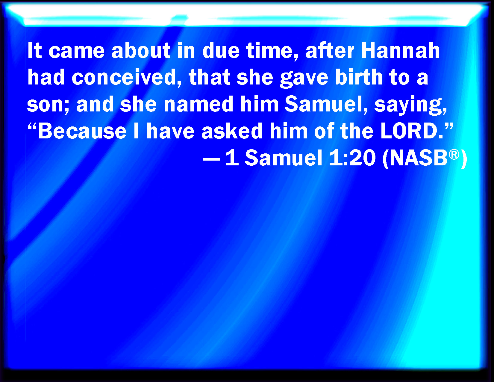 Bible Verse Slide 1 Samuel 1:20 Why it came to pass, when the time was come about after Hannah had conceived, that she bore a son, and called his name Samuel, saying, Because I have asked him of the LORD. KJV: Wherefore it came to pass, when the time was come about after Hannah had conceived, that she bare a son, and called his name Samuel, saying, Because I have asked him of the LORD. DRB: And it came to pass when the time was come about, Anna conceived and bore a son, and called his name Samuel: because she had asked him of the Lord. DBT: And it came to pass when the time was come about after Hannah had conceived, that she bore a son, and called his name Samuel, saying, Because I have asked him of Jehovah. ERV: And it came to pass, when the time was come about, that Hannah conceived, and bare a son; and she called his name Samuel, saying, Because I have asked him of the LORD. WBT: Wherefore it came to pass, when the time had arrived, after Hannah had conceived, that she bore a son, and called his name Samuel, saying, Because I have asked him of the LORD. WEB: It happened, when the time had come, that Hannah conceived, and bore a son; and she named him Samuel, [saying], "Because I have asked him of Yahweh." YLT: and it cometh to pass, at the revolution of the days, that Hannah conceiveth, and beareth a son, and calleth his name Samuel, 'for, from Jehovah I have asked him.'Links 1 Samuel 1:20 NIV • 1 Samuel 1:20 NLT • 1 Samuel 1:20 ESV • 1 Samuel 1:20 NASB • 1 Samuel 1:20 KJV • 1 Samuel 1:20 Interlinear • 1 Samuel 1:20 Commentaries • 1 Samuel 1:20 Parallel Texts • 1 Samuel 1:20 Bible Apps • 1 Samuel 1:20 Parallel • Bible Hub |