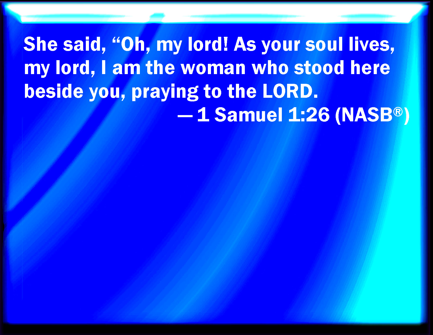 Bible Verse Slide 1 Samuel 1:26 And she said, Oh my lord, as your soul lives, my lord, I am the woman that stood by you here, praying to the LORD. KJV: And she said, Oh my lord, as thy soul liveth, my lord, I am the woman that stood by thee here, praying unto the LORD. DRB: And Anna said: I beseech thee, my lord, as thy soul liveth, my lord: I am that woman who stood before thee here praying to the Lord. DBT: And she said, Oh my lord, as thy soul liveth, my lord, I am the woman that stood by thee here to pray to Jehovah. ERV: And she said, Oh my lord, as thy soul liveth, my lord, I am the woman that stood by thee here, praying unto the LORD. WBT: And she said, O my lord, as thy soul liveth, my lord, I am the woman that stood by thee here, praying to the LORD. WEB: She said, "Oh, my lord, as your soul lives, my lord, I am the woman who stood by you here, praying to Yahweh. YLT: and she saith, 'O, my lord, thy soul liveth! my lord, I am the woman who stood with thee in this place, to pray unto Jehovah;Links 1 Samuel 1:26 NIV • 1 Samuel 1:26 NLT • 1 Samuel 1:26 ESV • 1 Samuel 1:26 NASB • 1 Samuel 1:26 KJV • 1 Samuel 1:26 Interlinear • 1 Samuel 1:26 Commentaries • 1 Samuel 1:26 Parallel Texts • 1 Samuel 1:26 Bible Apps • 1 Samuel 1:26 Parallel • Bible Hub |