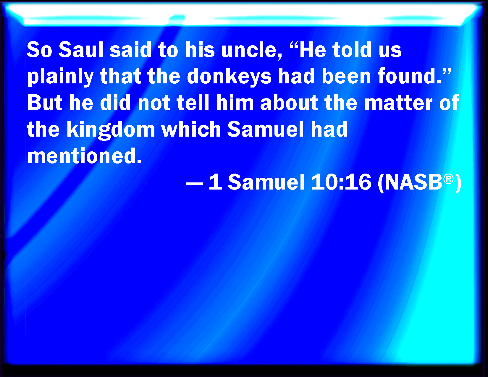 Bible Verse Slide 1 Samuel 10:16 And Saul said to his uncle, He told us plainly that the asses were found. But of the matter of the kingdom, whereof Samuel spoke, he told him not. KJV: And Saul said unto his uncle, He told us plainly that the asses were found. But of the matter of the kingdom, whereof Samuel spake, he told him not. DRB: And Saul said to his uncle: He told us that the asses were found. But of the matter of the kingdom of which Samuel had spoken to him, he told him not. DBT: And Saul said to his uncle, He told us for certain that the asses were found. But of the matter of the kingdom, of which Samuel had spoken, he told him not. ERV: And Saul said unto his uncle, He told us plainly that the asses were found. But concerning the matter of the kingdom, whereof Samuel spake, he told him not. WBT: And Saul said to his uncle, He told us plainly that the asses were found. But of the matter of the kingdom, of which Samuel spoke, he told him not. WEB: Saul said to his uncle, "He told us plainly that the donkeys were found." But concerning the matter of the kingdom, of which Samuel spoke, he didn't tell him. YLT: And Saul saith unto his uncle, 'He certainly declared to us that the asses were found;' and of the matter of the kingdom he hath not declared to him that which Samuel said.Links 1 Samuel 10:16 NIV • 1 Samuel 10:16 NLT • 1 Samuel 10:16 ESV • 1 Samuel 10:16 NASB • 1 Samuel 10:16 KJV • 1 Samuel 10:16 Interlinear • 1 Samuel 10:16 Commentaries • 1 Samuel 10:16 Parallel Texts • 1 Samuel 10:16 Bible Apps • 1 Samuel 10:16 Parallel • Bible Hub |
