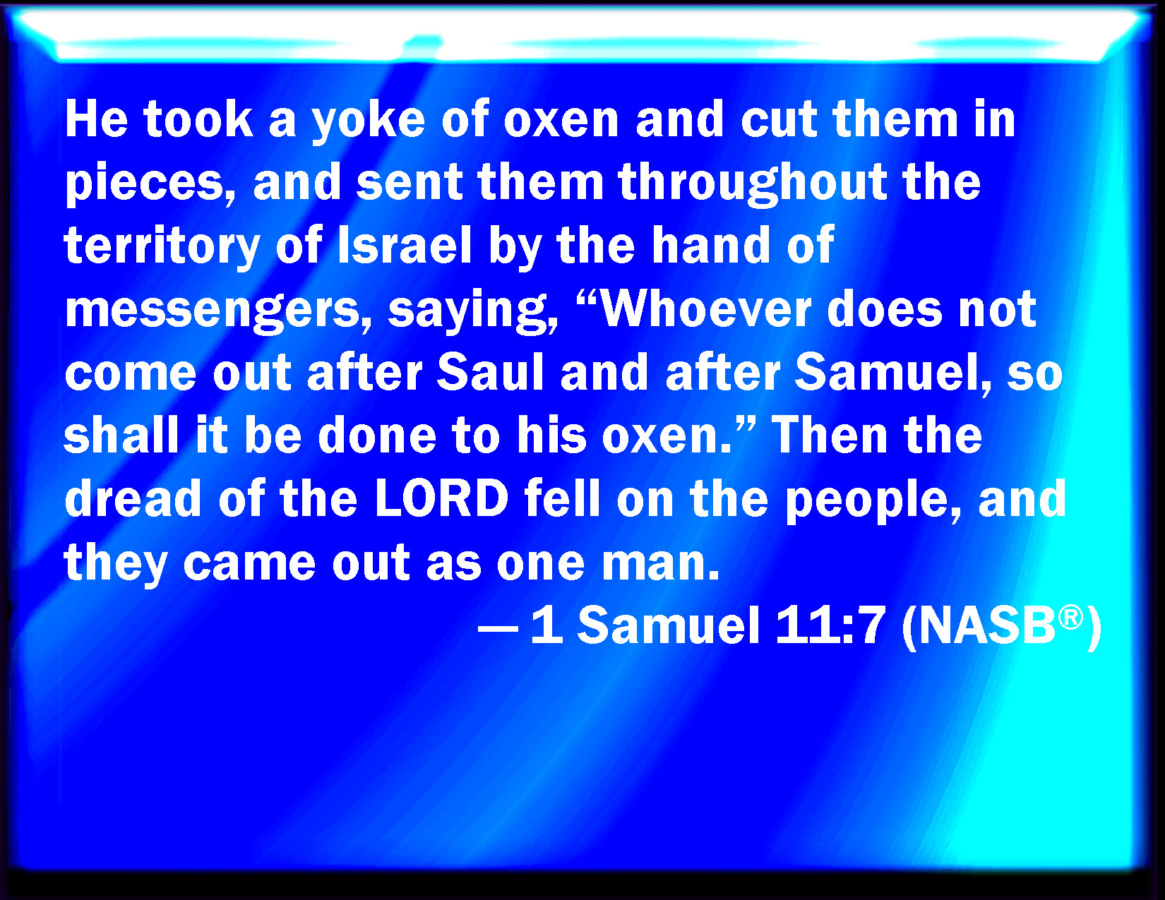 Bible Verse Slide 1 Samuel 11:7 And he took a yoke of oxen, and hewed them in pieces, and sent them throughout all the coasts of Israel by the hands of messengers, saying, Whoever comes not forth after Saul and after Samuel, so shall it be done to his oxen. And the fear of the LORD fell on the people, and they came out with one consent. KJV: And he took a yoke of oxen, and hewed them in pieces, and sent them throughout all the coasts of Israel by the hands of messengers, saying, Whosoever cometh not forth after Saul and after Samuel, so shall it be done unto his oxen. And the fear of the LORD fell on the people, and they came out with one consent. DRB: And taking both the oxen, he cut them in pieces, and sent them into all the coasts of Israel by messengers, saying: Whosoever shall not come forth, and follow Saul and Samuel, so shall it be done to his oxen. And the fear of the Lord fell upon the people, and they went out as one man. DBT: And he took a yoke of oxen and cut them in pieces, and sent throughout the territory of Israel by the hand of messengers, saying, Whoever comes not forth after Saul and after Samuel, so shall it be done to his oxen! And the fear of Jehovah fell on the people, and they came out as one man. ERV: And he took a yoke of oxen, and cut them in pieces, and sent them throughout all the borders of Israel by the hand of messengers, saying, Whosoever cometh not forth after Saul and after Samuel, so shall it be done unto his oxen. And the dread of the LORD fell on the people, and they came out as one man. WBT: And he took a yoke of oxen, and hewed them in pieces, and sent them throughout all the borders of Israel by the hands of messengers, saying, Whoever cometh not forth after Saul and after Samuel, so shall it be done to his oxen. And the fear of the LORD fell on the people, and they came out with one consent. WEB: He took a yoke of oxen, and cut them in pieces, and sent them throughout all the borders of Israel by the hand of messengers, saying, "Whoever doesn't come forth after Saul and after Samuel, so shall it be done to his oxen." The dread of Yahweh fell on the people, and they came out as one man. YLT: and he taketh a couple of oxen, and cutteth them in pieces, and sendeth through all the border of Israel, by the hand of the messengers, saying, 'He who is not coming out after Saul and after Samuel — thus it is done to his oxen;' and the fear of Jehovah falleth on the people, and they come out as one man.Links 1 Samuel 11:7 NIV • 1 Samuel 11:7 NLT • 1 Samuel 11:7 ESV • 1 Samuel 11:7 NASB • 1 Samuel 11:7 KJV • 1 Samuel 11:7 Interlinear • 1 Samuel 11:7 Commentaries • 1 Samuel 11:7 Parallel Texts • 1 Samuel 11:7 Bible Apps • 1 Samuel 11:7 Parallel • Bible Hub |