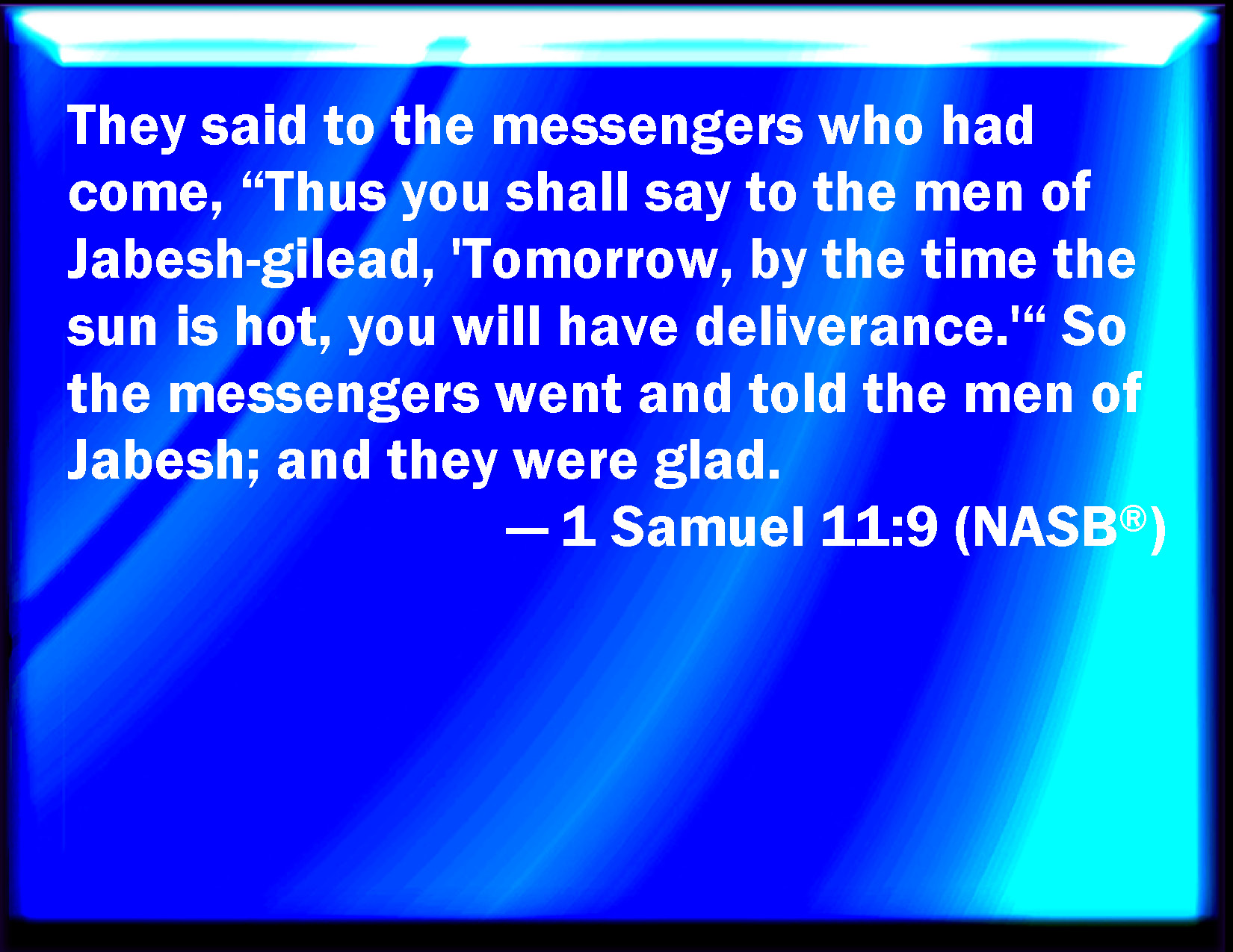 Bible Verse Slide 1 Samuel 11:9 And they said to the messengers that came, Thus shall you say to the men of Jabeshgilead, To morrow, by that time the sun be hot, you shall have help. And the messengers came and showed it to the men of Jabesh; and they were glad. KJV: And they said unto the messengers that came, Thus shall ye say unto the men of Jabeshgilead, To morrow, by that time the sun be hot, ye shall have help. And the messengers came and shewed it to the men of Jabesh; and they were glad. DRB: And they said to the messengers that came: Thus shall you say to the men of Jabes Galaad: To morrow, when the sun shall be hot, you shall have relief. The messengers therefore came, and told the men of Jabes: and they were glad. DBT: And they said to the messengers that had come, Thus shall ye say to the men of Jabesh-Gilead: To-morrow ye shall have deliverance when the sun is hot. And the messengers came and informed the men of Jabesh-Gilead; and they were glad. ERV: And they said unto the messengers that came, Thus shall ye say unto the men of Jabesh-gilead, Tomorrow, by the time the sun is hot, ye shall have deliverance. And the messengers came and told the men of Jabesh; and they were glad. WBT: And they said to the messengers that came, thus shall ye say to the men of Jabesh-gilead, To-morrow by the time the sun is hot, ye shall have help. And the messengers came and showed it to the men of Jabesh; and they were glad. WEB: They said to the messengers who came, "Thus you shall tell the men of Jabesh Gilead, 'Tomorrow, by the time the sun is hot, you shall have deliverance.'" The messengers came and told the men of Jabesh; and they were glad. YLT: And they say to the messengers who are coming, 'Thus do ye say to the men of Jabesh-Gilead: To-morrow ye have safety — by the heat of the sun;' and the messengers come and declare to the men of Jabesh, and they rejoice;Links 1 Samuel 11:9 NIV • 1 Samuel 11:9 NLT • 1 Samuel 11:9 ESV • 1 Samuel 11:9 NASB • 1 Samuel 11:9 KJV • 1 Samuel 11:9 Interlinear • 1 Samuel 11:9 Commentaries • 1 Samuel 11:9 Parallel Texts • 1 Samuel 11:9 Bible Apps • 1 Samuel 11:9 Parallel • Bible Hub |