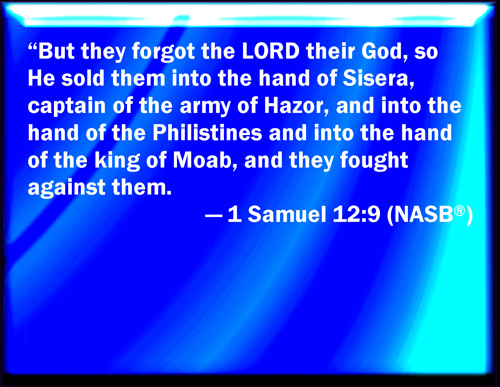 Bible Verse Slide 1 Samuel 12:9 And when they forgot the LORD their God, he sold them into the hand of Sisera, captain of the host of Hazor, and into the hand of the Philistines, and into the hand of the king of Moab, and they fought against them. KJV: And when they forgat the LORD their God, he sold them into the hand of Sisera, captain of the host of Hazor, and into the hand of the Philistines, and into the hand of the king of Moab, and they fought against them. DRB: And they forgot the Lord their God, and he delivered them into the hands of Sisara, captain of the army of Hasor, and into the hands of the Philistines, and into the hand of the king of Moab, and they fought against them. DBT: And they forgot Jehovah their God, and he sold them into the hand of Sisera, captain of the host of Hazor, and into the hand of the Philistines, and into the hand of the king of Moab, and they fought against them. ERV: But they forgat the LORD their God, and he sold them into the hand of Sisera, captain of the host of Hazor, and into the hand of the Philistines, and into the hand of the king of Moab, and they fought against them. WBT: And when they forgot the LORD their God, he sold them into the hand of Sisera, captain of the host of Hazor, and into the hand of the Philistines, and into the hand of the king of Moab, and they fought against them. WEB: "But they forgot Yahweh their God; and he sold them into the hand of Sisera, captain of the army of Hazor, and into the hand of the Philistines, and into the hand of the king of Moab; and they fought against them. YLT: and they forget Jehovah their God, and He selleth them into the hand of Sisera, head of the host of Hazor, and into the hand of the Philistines, and into the hand of the king of Moab, and they fight against them,Links 1 Samuel 12:9 NIV • 1 Samuel 12:9 NLT • 1 Samuel 12:9 ESV • 1 Samuel 12:9 NASB • 1 Samuel 12:9 KJV • 1 Samuel 12:9 Interlinear • 1 Samuel 12:9 Commentaries • 1 Samuel 12:9 Parallel Texts • 1 Samuel 12:9 Bible Apps • 1 Samuel 12:9 Parallel • Bible Hub |