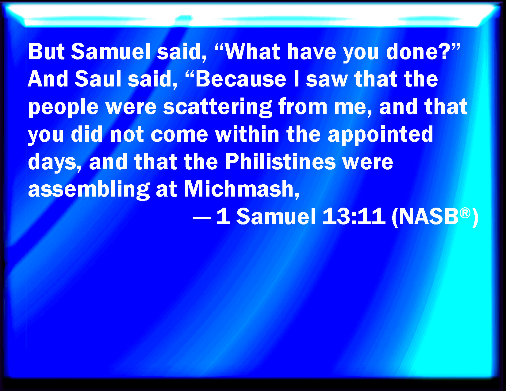 Bible Verse Slide 1 Samuel 13:11 And Samuel said, What have you done? And Saul said, Because I saw that the people were scattered from me, and that you came not within the days appointed, and that the Philistines gathered themselves together at Michmash; KJV: And Samuel said, What hast thou done? And Saul said, Because I saw that the people were scattered from me, and that thou camest not within the days appointed, and that the Philistines gathered themselves together at Michmash; DRB: And Samuel said to him: What hast thou done? Saul answered: Because I saw that the people slipt from me, and thou wast not come according to the days appointed, and the Philistines were gathered together in Machmas, DBT: And Samuel said, What hast thou done? And Saul said, Because I saw that the people were scattered from me, and that thou didst not come within the days appointed, and that the Philistines were assembled at Michmash, ERV: And Samuel said, What hast thou done? And Saul said, Because I saw that the people were scattered from me, and that thou camest not within the days appointed, and that the Philistines assembled themselves together at Michmash; WBT: And Samuel said, What hast thou done? And Saul said, Because I saw that the people were scattered from me, and that thou camest not within the days appointed, and that the Philistines assembled at Michmash; WEB: Samuel said, "What have you done?" Saul said, "Because I saw that the people were scattered from me, and that you didn't come within the days appointed, and that the Philistines assembled themselves together at Michmash; YLT: and Samuel saith, 'What hast thou done?' And Saul saith, 'Because I saw that the people were scattered from off me, and thou hadst not come at the appointment of the days, and the Philistines are gathered to Michmash,Links 1 Samuel 13:11 NIV • 1 Samuel 13:11 NLT • 1 Samuel 13:11 ESV • 1 Samuel 13:11 NASB • 1 Samuel 13:11 KJV • 1 Samuel 13:11 Interlinear • 1 Samuel 13:11 Commentaries • 1 Samuel 13:11 Parallel Texts • 1 Samuel 13:11 Bible Apps • 1 Samuel 13:11 Parallel • Bible Hub |