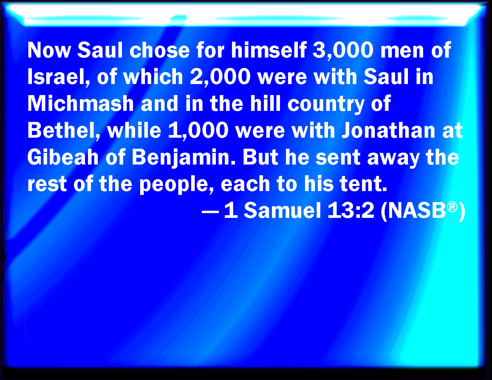 Saul chose him three thousand men of Israel, of which two thousand were with Saul in Michmash and in the Mount of Bethel, and one thousand were with Jonathan in Gibeah of Benjamin: and the rest of the people he sent every man to his tent.
