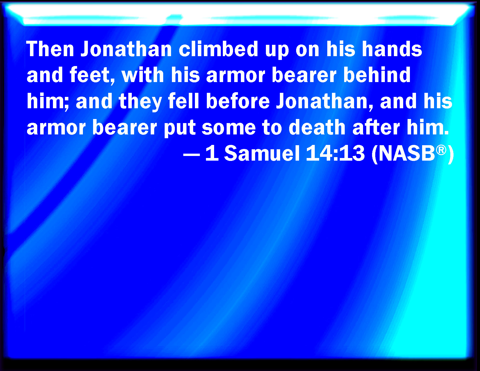 Bible Verse Slide 1 Samuel 14:13 And Jonathan climbed up on his hands and on his feet, and his armor bearer after him: and they fell before Jonathan; and his armor bearer slew after him. KJV: And Jonathan climbed up upon his hands and upon his feet, and his armourbearer after him: and they fell before Jonathan; and his armourbearer slew after him. DRB: And Jonathan went up creeping on his hands and feet, and his armourbearer after him. And some fell before Jonathan, others his armourbearer slew as he followed him. DBT: And Jonathan climbed up upon his hands and upon his feet, and his armour-bearer after him; and they fell before Jonathan; and his armour-bearer slew after him. ERV: And Jonathan climbed up upon his hands and upon his feet, and his armourbearer after him: and they fell before Jonathan; and his armourbearer slew them after him. WBT: And Jonathan climbed up upon his hands and upon his feet, and his armor-bearer after him: and they fell before Jonathan; and his armor-bearer slew after him. WEB: Jonathan climbed up on his hands and on his feet, and his armor bearer after him: and they fell before Jonathan; and his armor bearer killed them after him. YLT: And Jonathan goeth up on his hands, and on his feet, and the bearer of his weapons after him; and they fall before Jonathan, and the bearer of his weapons is putting to death after him.Links 1 Samuel 14:13 NIV • 1 Samuel 14:13 NLT • 1 Samuel 14:13 ESV • 1 Samuel 14:13 NASB • 1 Samuel 14:13 KJV • 1 Samuel 14:13 Interlinear • 1 Samuel 14:13 Commentaries • 1 Samuel 14:13 Parallel Texts • 1 Samuel 14:13 Bible Apps • 1 Samuel 14:13 Parallel • Bible Hub |