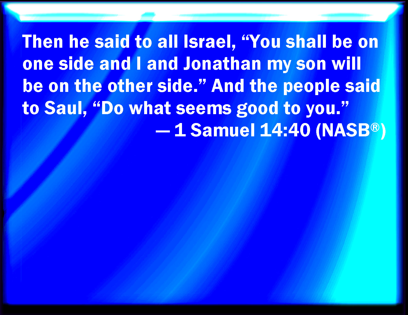 Bible Verse Slide 1 Samuel 14:40 Then said he to all Israel, Be you on one side, and I and Jonathan my son will be on the other side. And the people said to Saul, Do what seems good to you. KJV: Then said he unto all Israel, Be ye on one side, and I and Jonathan my son will be on the other side. And the people said unto Saul, Do what seemeth good unto thee. DRB: And he said to all Israel: Be you on one side, and I with Jonathan my son will be on the other side. And the people answered Saul: Do what seemeth good in thy eyes. DBT: Then said he to all Israel, Be ye on one side, and I and Jonathan my son will be on the other side. And the people said to Saul, Do what is good in thy sight. ERV: Then said he unto all Israel, Be ye on one side, and I and Jonathan my son will be on the other side. And the people said unto Saul, Do what seemeth good unto thee. WBT: Then said he to all Israel, Be ye on one side, and I and Jonathan my son will be on the other side. And the people said to Saul, Do what seemeth good to thee. WEB: Then he said to all Israel, "You be on one side, and I and Jonathan my son will be on the other side." The people said to Saul, "Do what seems good to you." YLT: And he saith unto all Israel, 'Ye — ye are on one side, and I and Jonathan my son are on another side;' and the people say unto Saul, 'That which is good in thine eyes do.'Links 1 Samuel 14:40 NIV • 1 Samuel 14:40 NLT • 1 Samuel 14:40 ESV • 1 Samuel 14:40 NASB • 1 Samuel 14:40 KJV • 1 Samuel 14:40 Interlinear • 1 Samuel 14:40 Commentaries • 1 Samuel 14:40 Parallel Texts • 1 Samuel 14:40 Bible Apps • 1 Samuel 14:40 Parallel • Bible Hub |