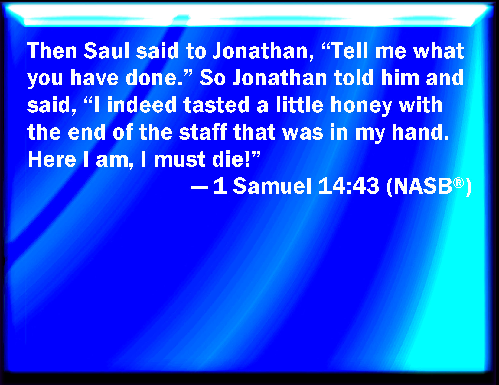 Bible Verse Slide 1 Samuel 14:43 Then Saul said to Jonathan, Tell me what you have done. And Jonathan told him, and said, I did but taste a little honey with the end of the rod that was in my hand, and, see, I must die. KJV: Then Saul said to Jonathan, Tell me what thou hast done. And Jonathan told him, and said, I did but taste a little honey with the end of the rod that was in mine hand, and, lo, I must die. DRB: And Saul said to Jonathan: Tell me what thou hast done. And Jonathan told him, and said: I did but taste a little honey with the end of the rod, which was in my hand, and behold I must die. DBT: And Saul said to Jonathan, Tell me what thou hast done. And Jonathan told him and said, With the end of the staff which is in my hand I tasted a little honey, and behold, I must die! ERV: Then Saul said to Jonathan, Tell me what thou hast done. And Jonathan told him, and said, I did certainly taste a little honey with the end of the rod that was in mine hand; and, lo, I must die. WBT: Then Saul said to Jonathan, Tell me what thou hast done. And Jonathan told him, and said, I did but taste a little honey with the end of the rod that was in my hand, and, lo, I must die. WEB: Then Saul said to Jonathan, "Tell me what you have done!" Jonathan told him, and said, "I certainly did taste a little honey with the end of the rod that was in my hand; and behold, I must die." YLT: And Saul saith unto Jonathan, 'Declare to me, what hast thou done?' and Jonathan declareth to him, and saith, 'I certainly tasted with the end of the rod that is in my hand a little honey; lo, I die!'Links 1 Samuel 14:43 NIV • 1 Samuel 14:43 NLT • 1 Samuel 14:43 ESV • 1 Samuel 14:43 NASB • 1 Samuel 14:43 KJV • 1 Samuel 14:43 Interlinear • 1 Samuel 14:43 Commentaries • 1 Samuel 14:43 Parallel Texts • 1 Samuel 14:43 Bible Apps • 1 Samuel 14:43 Parallel • Bible Hub |