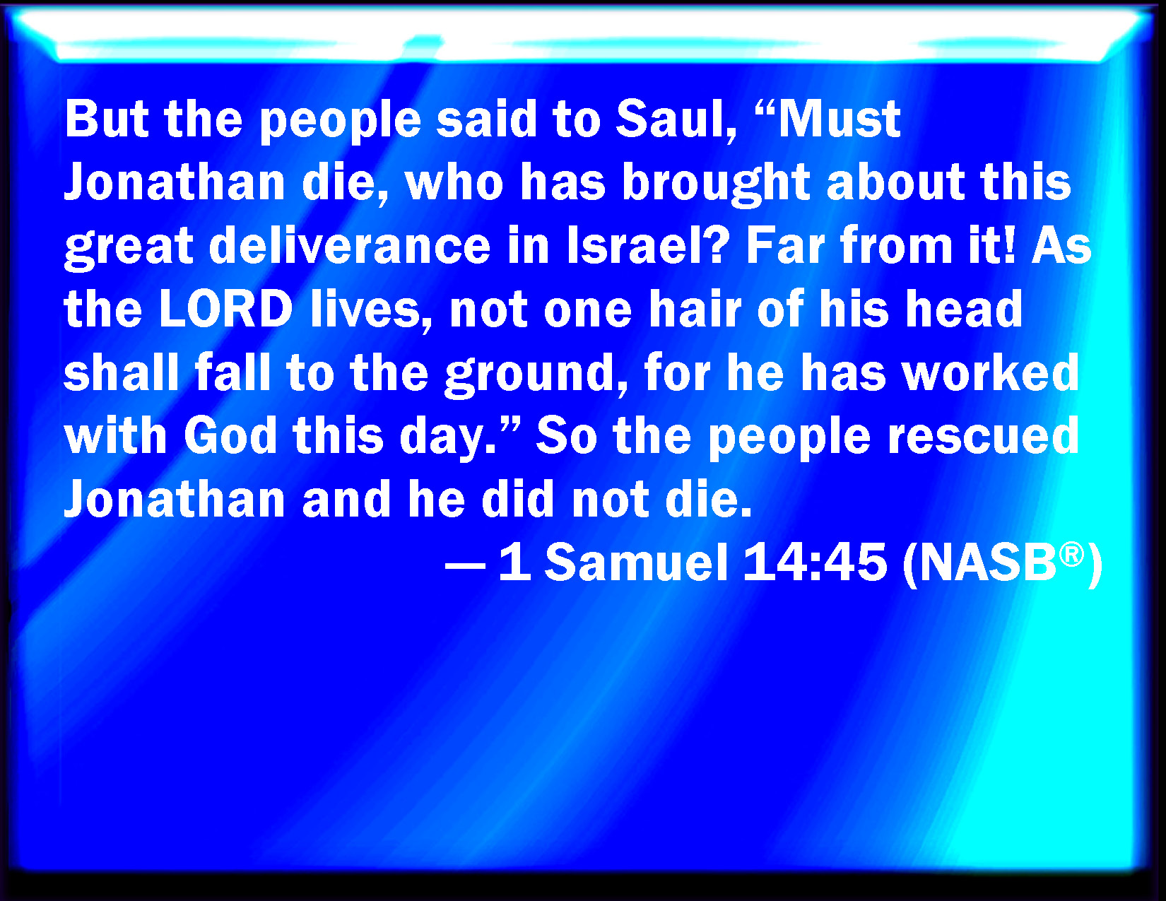 Bible Verse Slide 1 Samuel 14:45 And the people said to Saul, Shall Jonathan die, who has worked this great salvation in Israel? God forbid: as the LORD lives, there shall not one hair of his head fall to the ground; for he has worked with God this day. So the people rescued Jonathan, that he died not. KJV: And the people said unto Saul, Shall Jonathan die, who hath wrought this great salvation in Israel? God forbid: as the LORD liveth, there shall not one hair of his head fall to the ground; for he hath wrought with God this day. So the people rescued Jonathan, that he died not. DRB: And the people said to Saul: Shall Jonathan then die, who hath wrought this great salvation in Israel? This must not be. As the Lord liveth, there shall not one hair of his head fall to the ground, for he hath wrought with God this day. So the people delivered Jonathan, that he should not die. DBT: And the people said to Saul, Shall Jonathan die, who has wrought this great salvation in Israel? Far be it! as Jehovah liveth, there shall not a hair of his head fall to the ground; for he has wrought with God this day. So the people delivered Jonathan, that he died not. ERV: And the people said unto Saul, Shall Jonathan die, who hath wrought this great salvation in Israel? God forbid: as the LORD liveth, there shall not one hair of his head fall to the ground; for he hath wrought with God this day. So the people rescued Jonathan, that he died not. WBT: And the people said to Saul, Shall Jonathan die, who hath wrought this great salvation in Israel? By no means: as the LORD liveth, there shall not one hair of his head fall to the ground; for he hath wrought with God this day. So the people rescued Jonathan, that he died not. WEB: The people said to Saul, "Shall Jonathan die, who has worked this great salvation in Israel? Far from it! As Yahweh lives, there shall not one hair of his head fall to the ground; for he has worked with God this day!" So the people rescued Jonathan, that he didn't die. YLT: And the people say unto Saul, 'Doth Jonathan die who wrought this great salvation in Israel? — a profanation! Jehovah liveth, if there falleth from the hair of his head to the earth, for with God he hath wrought this day;' and the people rescue Jonathan, and he hath not died.Links 1 Samuel 14:45 NIV • 1 Samuel 14:45 NLT • 1 Samuel 14:45 ESV • 1 Samuel 14:45 NASB • 1 Samuel 14:45 KJV • 1 Samuel 14:45 Interlinear • 1 Samuel 14:45 Commentaries • 1 Samuel 14:45 Parallel Texts • 1 Samuel 14:45 Bible Apps • 1 Samuel 14:45 Parallel • Bible Hub |