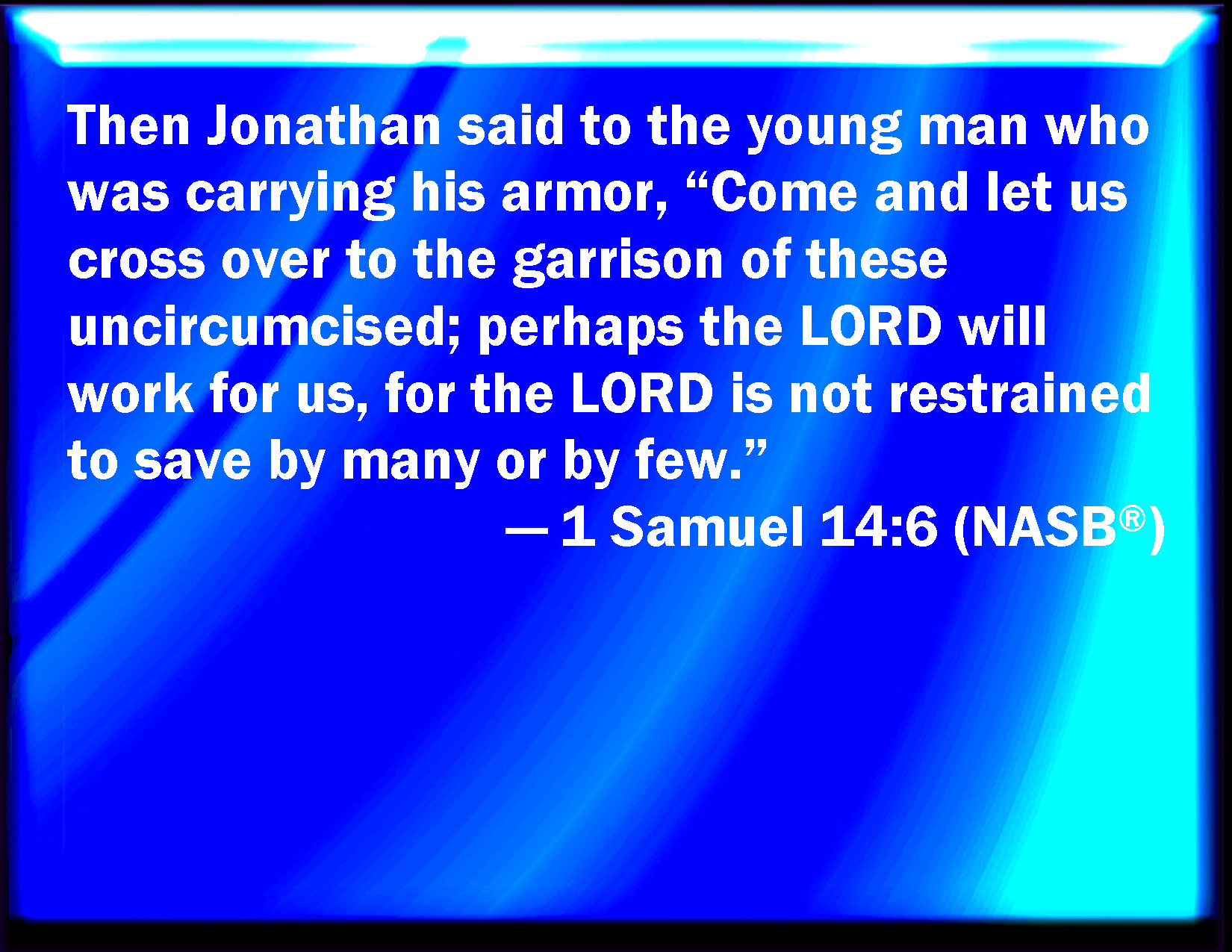 Bible Verse Slide 1 Samuel 14:6 And Jonathan said to the young man that bore his armor, Come, and let us go over to the garrison of these uncircumcised: it may be that the LORD will work for us: for there is no restraint to the LORD to save by many or by few. KJV: And Jonathan said to the young man that bare his armour, Come, and let us go over unto the garrison of these uncircumcised: it may be that the LORD will work for us: for there is no restraint to the LORD to save by many or by few. DRB: And Jonathan said to the young man that bore his armour: Come, let us go over to the garrison of these uncircumcised, it may be the Lord will do for us, because it is easy for the Lord to save either by many, or by few. DBT: And Jonathan said to the young man that bore his armour, Come, and let us go over to the garrison of these uncircumcised: perhaps Jehovah will work for us; for there is no restraint to Jehovah to save by many or by few. ERV: And Jonathan said to the young man that bare his armour, Come and let us go over unto the garrison of these uncircumcised: it may be that the LORD will work for us: for there is no restraint to the LORD to save by many or by few. WBT: And Jonathan said to the young man that bore his armor, Come, and let us go over to the garrison of these uncircumcised: it may be that the LORD will work for us: for there is no restraint to the LORD to save by many or by few. WEB: Jonathan said to the young man who bore his armor, "Come, and let us go over to the garrison of these uncircumcised. It may be that Yahweh will work for us; for there is no restraint on Yahweh to save by many or by few." YLT: And Jonathan saith unto the young man bearing his weapons, 'Come, and we pass over unto the station of these uncircumcised; it may be Jehovah doth work for us, for there is no restraint to Jehovah to save by many or by few.'Links 1 Samuel 14:6 NIV • 1 Samuel 14:6 NLT • 1 Samuel 14:6 ESV • 1 Samuel 14:6 NASB • 1 Samuel 14:6 KJV • 1 Samuel 14:6 Interlinear • 1 Samuel 14:6 Commentaries • 1 Samuel 14:6 Parallel Texts • 1 Samuel 14:6 Bible Apps • 1 Samuel 14:6 Parallel • Bible Hub |