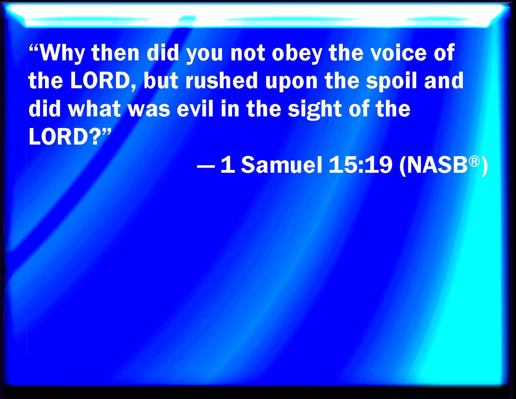 Bible Verse Slide 1 Samuel 15:19 Why then did you not obey the voice of the LORD, but did fly on the spoil, and did evil in the sight of the LORD? KJV: Wherefore then didst thou not obey the voice of the LORD, but didst fly upon the spoil, and didst evil in the sight of the LORD? DRB: Why then didst thou not hearken to the voice of the Lord: but hast turned to the prey, and hast done evil in the eyes of the Lord. DBT: Why then didst thou not hearken to the voice of Jehovah, but didst fall upon the spoil, and didst evil in the sight of Jehovah? ERV: wherefore then didst thou not obey the voice of the LORD, but didst fly upon the spoil, and didst that which was evil in the sight of the LORD? WBT: Why then didst thou not obey the voice of the LORD, but didst fly upon the spoil, and didst evil in the sight of the LORD? WEB: Why then didn't you obey the voice of Yahweh, but took the spoils, and did that which was evil in the sight of Yahweh?" YLT: and why hast thou not hearkened to the voice of Jehovah — and dost fly unto the spoil, and dost do the evil thing in the eyes of Jehovah?'Links 1 Samuel 15:19 NIV • 1 Samuel 15:19 NLT • 1 Samuel 15:19 ESV • 1 Samuel 15:19 NASB • 1 Samuel 15:19 KJV • 1 Samuel 15:19 Interlinear • 1 Samuel 15:19 Commentaries • 1 Samuel 15:19 Parallel Texts • 1 Samuel 15:19 Bible Apps • 1 Samuel 15:19 Parallel • Bible Hub |
