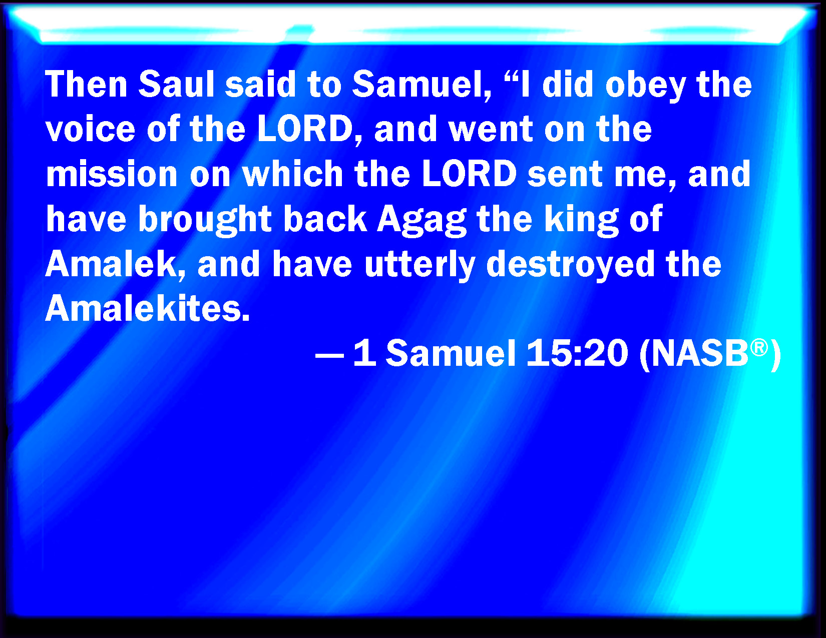 Bible Verse Slide 1 Samuel 15:20 And Saul said to Samuel, Yes, I have obeyed the voice of the LORD, and have gone the way which the LORD sent me, and have brought Agag the king of Amalek, and have utterly destroyed the Amalekites. KJV: And Saul said unto Samuel, Yea, I have obeyed the voice of the LORD, and have gone the way which the LORD sent me, and have brought Agag the king of Amalek, and have utterly destroyed the Amalekites. DRB: And Saul said to Samuel: Yea I have hearkened to the voice of the Lord, and have walked in the way by which the Lord sent me, and have brought Agag the king of Amalec, and Amalec I have slain. DBT: And Saul said to Samuel, I have indeed hearkened to the voice of Jehovah, and have gone the way which Jehovah sent me, and have brought Agag the king of Amalek, and have utterly destroyed the Amalekites. ERV: And Saul said unto Samuel, Yea, I have obeyed the voice of the LORD, and have gone the way which the LORD sent me, and have brought Agag the king of Amalek, and have utterly destroyed the Amalekites. WBT: And Saul said to Samuel, Yea, I have obeyed the voice of the LORD, and have gone the way which the LORD sent me, and have brought Agag the king of Amalek, and have utterly destroyed the Amalekites. WEB: Saul said to Samuel, "But I have obeyed the voice of Yahweh, and have gone the way which Yahweh sent me, and have brought Agag the king of Amalek, and have utterly destroyed the Amalekites. YLT: And Saul saith unto Samuel, 'Because — I have hearkened to the voice of Jehovah, and I go in the way which Jehovah hath sent me, and bring in Agag king of Amalek, and Amalek I have devoted;Links 1 Samuel 15:20 NIV • 1 Samuel 15:20 NLT • 1 Samuel 15:20 ESV • 1 Samuel 15:20 NASB • 1 Samuel 15:20 KJV • 1 Samuel 15:20 Interlinear • 1 Samuel 15:20 Commentaries • 1 Samuel 15:20 Parallel Texts • 1 Samuel 15:20 Bible Apps • 1 Samuel 15:20 Parallel • Bible Hub |
