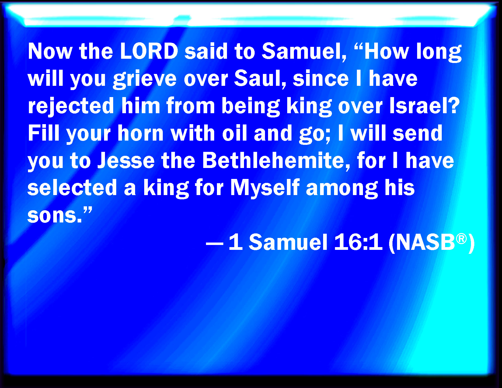 Bible Verse Slide 1 Samuel 16:1 And the LORD said to Samuel, How long will you mourn for Saul, seeing I have rejected him from reigning over Israel? fill your horn with oil, and go, I will send you to Jesse the Bethlehemite: for I have provided me a king among his sons. KJV: And the LORD said unto Samuel, How long wilt thou mourn for Saul, seeing I have rejected him from reigning over Israel? fill thine horn with oil, and go, I will send thee to Jesse the Bethlehemite: for I have provided me a king among his sons. DRB: And the Lord said to Samuel. How It long wilt thou mourn for Saul, whom I have rejected from reigning over Israel? fill thy horn with oil, and come, that I may send thee to Isai the Bethlehemite: for I have provided me a king among his sons. DBT: And Jehovah said to Samuel, How long wilt thou mourn for Saul, seeing I have rejected him from reigning over Israel? fill thy horn with oil, and go, I will send thee to Jesse the Bethlehemite; for I have provided me a king among his sons. ERV: And the LORD said unto Samuel, How long wilt thou mourn for Saul, seeing I have rejected him from being king over Israel? fill thine horn with oil, and go, I will send thee to Jesse the Beth-lehemite: for I have provided me a king among his sons. WBT: And the LORD said to Samuel, How long wilt thou mourn for Saul, seeing I have rejected him from reigning over Israel? fill thy horn with oil, and go, I will send thee to Jesse the Beth-lehemite: for I have provided me a king among his sons. WEB: Yahweh said to Samuel, "How long will you mourn for Saul, since I have rejected him from being king over Israel? Fill your horn with oil, and go. I will send you to Jesse the Bethlehemite; for I have provided a king for myself among his sons." YLT: And Jehovah saith unto Samuel, 'Till when art thou mourning for Saul, and I have rejected him from reigning over Israel? fill thy horn with oil, and go, I send thee unto Jesse the Beth-Lehemite, for I have seen among his sons for Myself a king.Links 1 Samuel 16:1 NIV • 1 Samuel 16:1 NLT • 1 Samuel 16:1 ESV • 1 Samuel 16:1 NASB • 1 Samuel 16:1 KJV • 1 Samuel 16:1 Interlinear • 1 Samuel 16:1 Commentaries • 1 Samuel 16:1 Parallel Texts • 1 Samuel 16:1 Bible Apps • 1 Samuel 16:1 Parallel • Bible Hub |