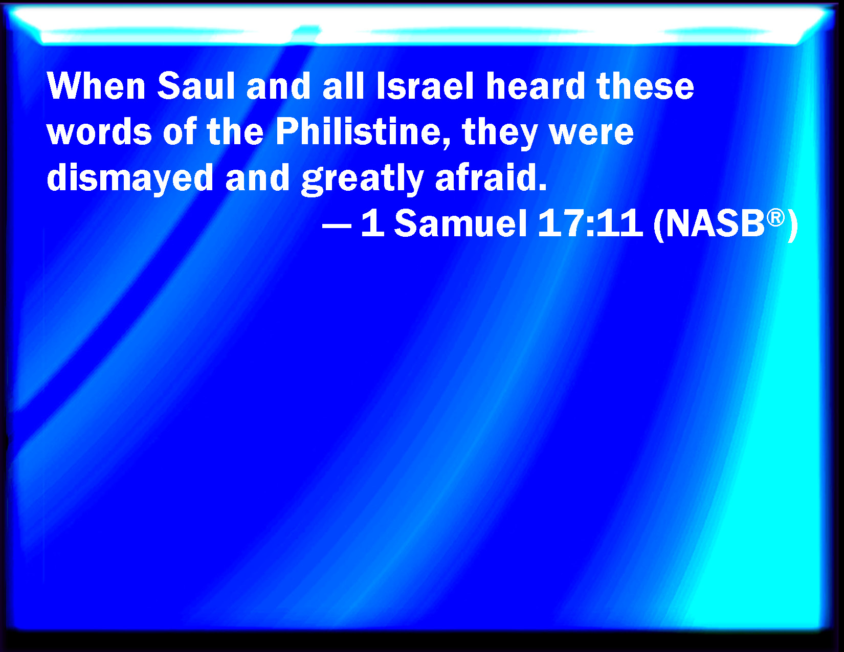 Bible Verse Slide 1 Samuel 17:11 When Saul and all Israel heard those words of the Philistine, they were dismayed, and greatly afraid. KJV: When Saul and all Israel heard those words of the Philistine, they were dismayed, and greatly afraid. DRB: And Saul and all the Israelites hearing these words of the Philistine were dismayed, and greatly afraid. DBT: And Saul and all Israel heard these words of the Philistine, and they were dismayed and greatly afraid. ERV: And when Saul and all Israel heard those words of the Philistine, they were dismayed, and greatly afraid. WBT: When Saul and all Israel heard those words of the Philistine, they were dismayed, and greatly afraid. WEB: When Saul and all Israel heard those words of the Philistine, they were dismayed, and greatly afraid. YLT: And Saul heareth — and all Israel — these words of the Philistine, and they are broken down and greatly afraid.Links 1 Samuel 17:11 NIV • 1 Samuel 17:11 NLT • 1 Samuel 17:11 ESV • 1 Samuel 17:11 NASB • 1 Samuel 17:11 KJV • 1 Samuel 17:11 Interlinear • 1 Samuel 17:11 Commentaries • 1 Samuel 17:11 Parallel Texts • 1 Samuel 17:11 Bible Apps • 1 Samuel 17:11 Parallel • Bible Hub |