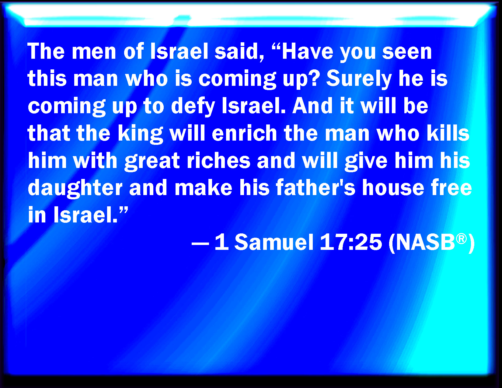 Bible Verse Slide 1 Samuel 17:25 And the men of Israel said, Have you seen this man that is come up? surely to defy Israel is he come up: and it shall be, that the man who kills him, the king will enrich him with great riches, and will give him his daughter, and make his father's house free in Israel. KJV: And the men of Israel said, Have ye seen this man that is come up? surely to defy Israel is he come up: and it shall be, that the man who killeth him, the king will enrich him with great riches, and will give him his daughter, and make his father's house free in Israel. DRB: And some one of Israel said: Have you seen this man that is come up, for he is come up to defy Israel. And the man that shall slay him, the king will enrich with great riches, and will give him his daughter, and will make his father's house free from tribute in Israel. DBT: And the men of Israel said, Have ye seen this man that comes up? for to defy Israel is he come up: and it shall be, that the man who smites him, him will the king enrich with great riches, and will give him his daughter, and make his father's house free in Israel. ERV: And the men of Israel said, Have ye seen this man that is come up? surely to defy Israel is he come up: and it shall be, that the man who killeth him, the king will enrich him with great riches, and will give him his daughter, and make his father's house free in Israel. WBT: And the men of Israel said, Have ye seen this man that hath come up? surely to defy Israel hath he come: and it shall be, that the man who shall kill him, the king will enrich him with great riches, and will give him his daughter, and make his father's house free in Israel. WEB: The men of Israel said, "Have you seen this man who is come up? He has surely come up to defy Israel. It shall be, that the man who kills him, the king will enrich him with great riches, and will give him his daughter, and make his father's house free in Israel." YLT: And the men of Israel say, 'Have ye seen this man who is coming up? for, to reproach Israel he is coming up, and it hath been — the man who smiteth him, the king doth enrich him with great riches, and his daughter he doth give to him, and his father's house doth make free in Israel.'Links 1 Samuel 17:25 NIV • 1 Samuel 17:25 NLT • 1 Samuel 17:25 ESV • 1 Samuel 17:25 NASB • 1 Samuel 17:25 KJV • 1 Samuel 17:25 Interlinear • 1 Samuel 17:25 Commentaries • 1 Samuel 17:25 Parallel Texts • 1 Samuel 17:25 Bible Apps • 1 Samuel 17:25 Parallel • Bible Hub |