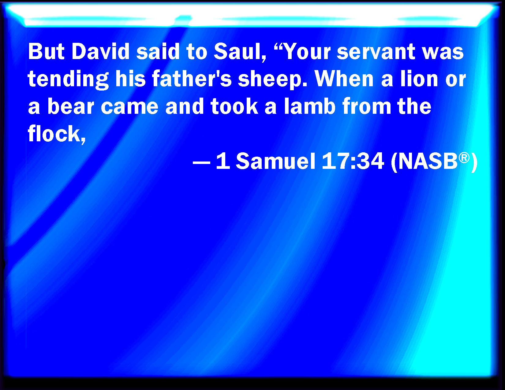 Bible Verse Slide 1 Samuel 17:34 And David said to Saul, Your servant kept his father's sheep, and there came a lion, and a bear, and took a lamb out of the flock: KJV: And David said unto Saul, Thy servant kept his father's sheep, and there came a lion, and a bear, and took a lamb out of the flock: DRB: And David said to Saul: Thy servant kept his father's sheep, and there came a lion, or a bear, and took a ram out of the midst of the flock: DBT: And David said to Saul, Thy servant fed his father's sheep, and there came a lion, and also a bear, and took a lamb out of the flock. ERV: And David said unto Saul, Thy servant kept his father's sheep; and when there came a lion, or a bear, and took a lamb out of the flock, WBT: And David said to Saul, Thy servant kept his father's sheep, and there came a lion, and a bear, and took a lamb out of the flock: WEB: David said to Saul, "Your servant was keeping his father's sheep; and when a lion or a bear came, and took a lamb out of the flock, YLT: And David saith unto Saul, 'A shepherd hath thy servant been to his father among the sheep, and the lion hath come — and the bear — and hath taken away a sheep out of the drove,Links 1 Samuel 17:34 NIV • 1 Samuel 17:34 NLT • 1 Samuel 17:34 ESV • 1 Samuel 17:34 NASB • 1 Samuel 17:34 KJV • 1 Samuel 17:34 Interlinear • 1 Samuel 17:34 Commentaries • 1 Samuel 17:34 Parallel Texts • 1 Samuel 17:34 Bible Apps • 1 Samuel 17:34 Parallel • Bible Hub |
