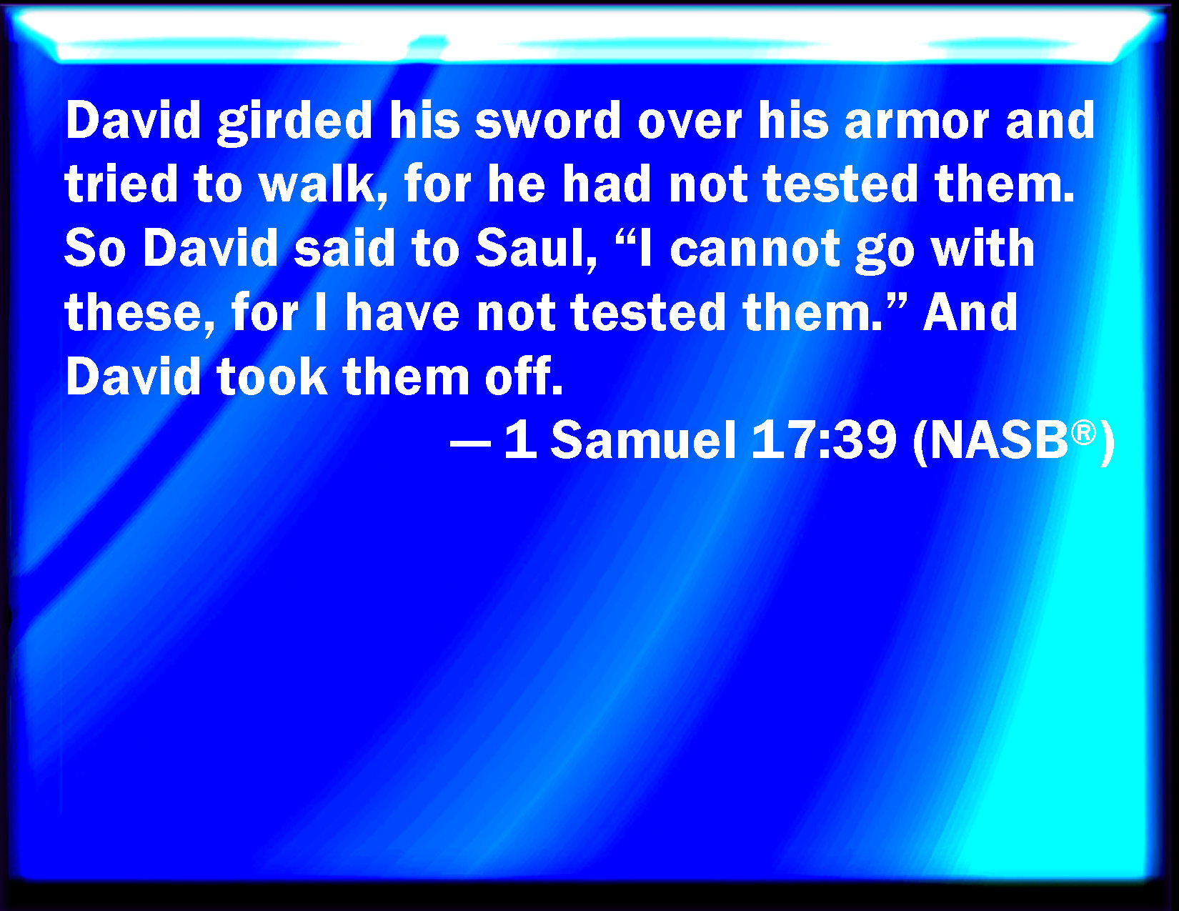 Bible Verse Slide 1 Samuel 17:39 And David girded his sword on his armor, and he assayed to go; for he had not proved it. And David said to Saul, I cannot go with these; for I have not proved them. And David put them off him. KJV: And David girded his sword upon his armour, and he assayed to go; for he had not proved it. And David said unto Saul, I cannot go with these; for I have not proved them. And David put them off him. DRB: And David having girded his sword upon his armour, began to try if he could walk in armour: for he was not accustomed to it. And David said to Saul: I cannot go thus, for I am not used to it. And he laid them off, DBT: And David girded his sword upon his dress, and endeavoured to go; for he had not yet tried it. And David said to Saul, I cannot go in these; for I have never tried them. And David put them off him. ERV: And David girded his sword upon his apparel, and he assayed to go; for he had not proved it. And David said unto Saul, I cannot go with these; for I have not proved them. And David put them off him. WBT: And David girded his sword upon his armor, and he essayed to go; for he had not proved it. And David said to Saul, I cannot go with these, for I have not proved them. And David put them off from him. WEB: David strapped his sword on his clothing, and he tried to move; for he had not tested it. David said to Saul, "I can't go with these; for I have not tested them." David took them off. YLT: And David girded his sword above his long robe, and beginneth to go, for he hath not tried it; and David saith unto Saul, 'I am not able to go with these, for I had not tried;' and David turneth them aside from off him.Links 1 Samuel 17:39 NIV • 1 Samuel 17:39 NLT • 1 Samuel 17:39 ESV • 1 Samuel 17:39 NASB • 1 Samuel 17:39 KJV • 1 Samuel 17:39 Interlinear • 1 Samuel 17:39 Commentaries • 1 Samuel 17:39 Parallel Texts • 1 Samuel 17:39 Bible Apps • 1 Samuel 17:39 Parallel • Bible Hub |