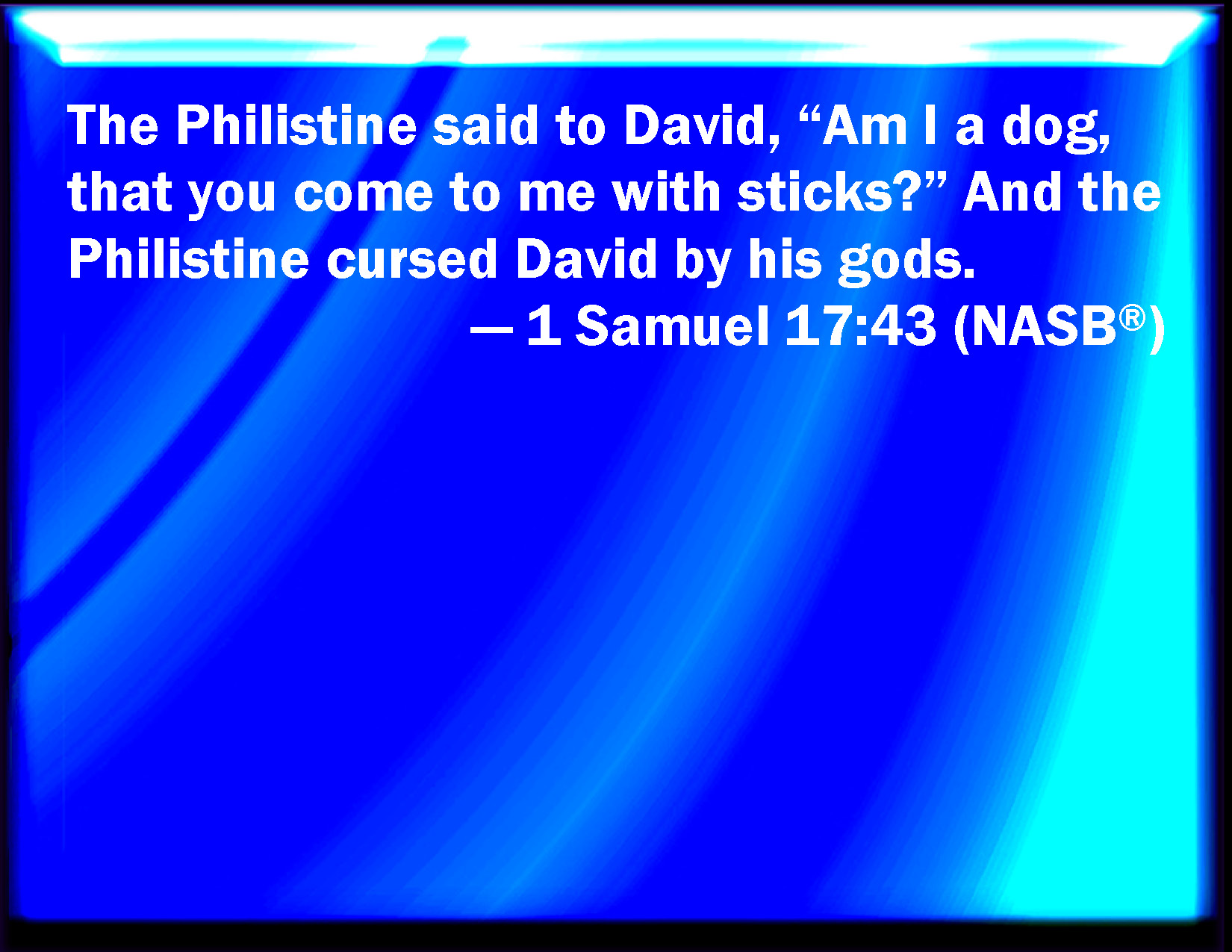 Bible Verse Slide 1 Samuel 17:43 And the Philistine said to David, Am I a dog, that you come to me with staves? And the Philistine cursed David by his gods. KJV: And the Philistine said unto David, Am I a dog, that thou comest to me with staves? And the Philistine cursed David by his gods. DRB: And the Philistine said to David: Am I a dog, that thou comest to me with a staff? And the Philistine cursed David by his gods. DBT: And the Philistine said to David, Am I a dog, that thou comest to me with staves? And the Philistine cursed David by his gods. ERV: And the Philistine said unto David, Am I a dog, that thou comest to me with staves? And the Philistine cursed David by his gods. WBT: And the Philistine said to David, Am I a dog, that thou comest to me with staffs? and the Philistine cursed David by his gods. WEB: The Philistine said to David, "Am I a dog, that you come to me with sticks?" The Philistine cursed David by his gods. YLT: And the Philistine saith unto David, 'Am I a dog that thou art coming unto me with staves?' and the Philistine revileth David by his gods,Links 1 Samuel 17:43 NIV • 1 Samuel 17:43 NLT • 1 Samuel 17:43 ESV • 1 Samuel 17:43 NASB • 1 Samuel 17:43 KJV • 1 Samuel 17:43 Interlinear • 1 Samuel 17:43 Commentaries • 1 Samuel 17:43 Parallel Texts • 1 Samuel 17:43 Bible Apps • 1 Samuel 17:43 Parallel • Bible Hub |
