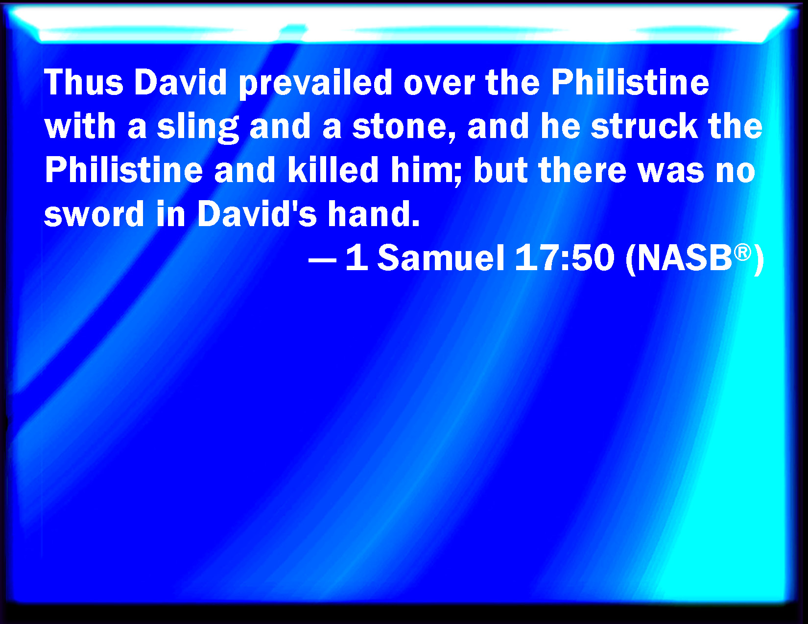 Bible Verse Slide 1 Samuel 17:50 So David prevailed over the Philistine with a sling and with a stone, and smote the Philistine, and slew him; but there was no sword in the hand of David. KJV: So David prevailed over the Philistine with a sling and with a stone, and smote the Philistine, and slew him; but there was no sword in the hand of David. DRB: And David prevailed over the Philistine, with a sling and a stone, and he struck, and slew the Philistine. And as David had no sword in his hand, DBT: So David overcame the Philistine with a sling and a stone, and smote the Philistine and killed him; and there was no sword in the hand of David. ERV: So David prevailed over the Philistine with a sling and with a stone, and smote the Philistine, and slew him; but there was no sword in the hand of David. WBT: So David prevailed over the Philistine with a sling and with a stone, and smote the Philistine, and slew him; but there was no sword in the hand of David. WEB: So David prevailed over the Philistine with a sling and with a stone, and struck the Philistine, and killed him; but there was no sword in the hand of David. YLT: And David is stronger than the Philistine with a sling and with a stone, and smiteth the Philistine, and putteth him to death, and there is no sword in the hand of David,Links 1 Samuel 17:50 NIV • 1 Samuel 17:50 NLT • 1 Samuel 17:50 ESV • 1 Samuel 17:50 NASB • 1 Samuel 17:50 KJV • 1 Samuel 17:50 Interlinear • 1 Samuel 17:50 Commentaries • 1 Samuel 17:50 Parallel Texts • 1 Samuel 17:50 Bible Apps • 1 Samuel 17:50 Parallel • Bible Hub |