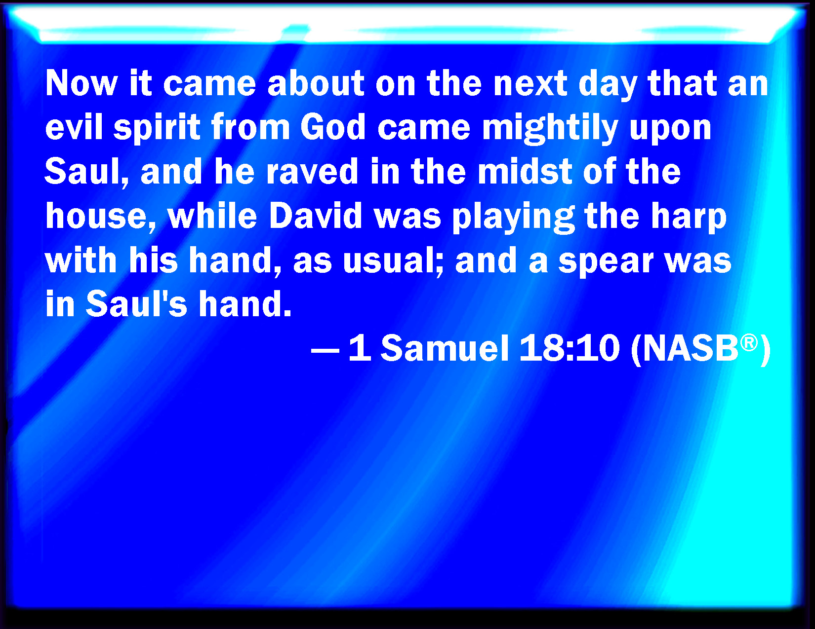 Bible Verse Slide 1 Samuel 18:10 And it came to pass on the morrow, that the evil spirit from God came on Saul, and he prophesied in the middle of the house: and David played with his hand, as at other times: and there was a javelin in Saul's hand. KJV: And it came to pass on the morrow, that the evil spirit from God came upon Saul, and he prophesied in the midst of the house: and David played with his hand, as at other times: and there was a javelin in Saul's hand. DRB: And the day after the evil spirit from God came upon Saul, and he prophesied in the midst of his house. And David played with his hand as at other times. And Saul held a spear in his hand, DBT: And it came to pass the next day that an evil spirit from God came upon Saul, and he prophesied in the midst of the house, but David played with his hand, as on other days; and the spear was in Saul's hand. ERV: And it came to pass on the morrow, that an evil spirit from God came mightily upon Saul, and he prophesied in the midst of the house: and David played with his hand, as he did day by day: and Saul had his spear in his hand. WBT: And it came to pass on the morrow, that the evil spirit from God came upon Saul, and he prophesied in the midst of the house: and David played with his hand, as at other times: and there was a javelin in Saul's hand. WEB: It happened on the next day, that an evil spirit from God came mightily on Saul, and he prophesied in the midst of the house. David played with his hand, as he did day by day. Saul had his spear in his hand; YLT: And it cometh to pass, on the morrow, that the spirit of sadness from God prospereth over Saul, and he prophesieth in the midst of the house, and David is playing with his hand, as day by day, and the javelin is in the hand of Saul,Links 1 Samuel 18:10 NIV • 1 Samuel 18:10 NLT • 1 Samuel 18:10 ESV • 1 Samuel 18:10 NASB • 1 Samuel 18:10 KJV • 1 Samuel 18:10 Interlinear • 1 Samuel 18:10 Commentaries • 1 Samuel 18:10 Parallel Texts • 1 Samuel 18:10 Bible Apps • 1 Samuel 18:10 Parallel • Bible Hub |