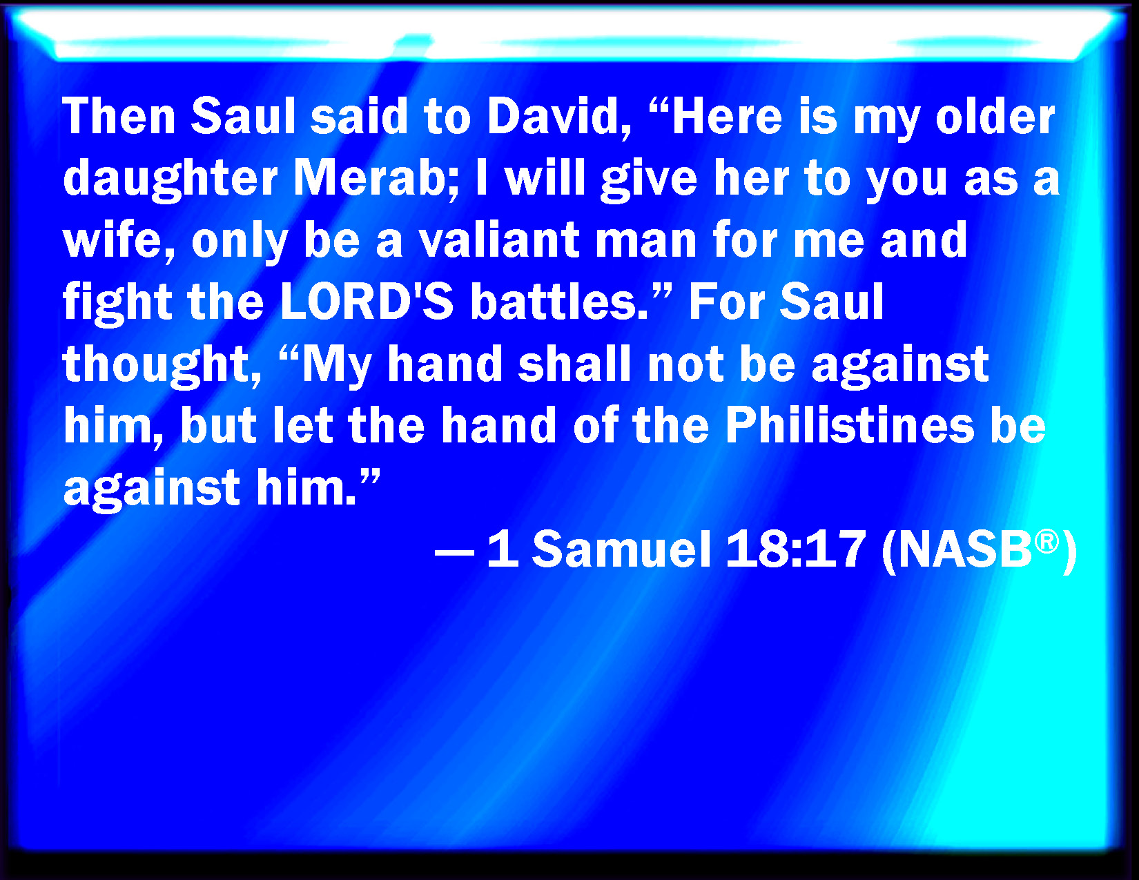 Bible Verse Slide 1 Samuel 18:17 And Saul said to David, Behold my elder daughter Merab, her will I give you to wife: only be you valiant for me, and fight the LORD's battles. For Saul said, Let not my hand be on him, but let the hand of the Philistines be on him. KJV: And Saul said to David, Behold my elder daughter Merab, her will I give thee to wife: only be thou valiant for me, and fight the LORD'S battles. For Saul said, Let not mine hand be upon him, but let the hand of the Philistines be upon him. DRB: And Saul said to David: Behold my elder daughter Merob, her will I give thee to wife: only be a valiant man, and fight the battles of the Lord. Now Saul said within himself: Let not my hand be upon him, but let the hands of the Philistines be upon him. DBT: And Saul said to David, Behold my eldest daughter Merab, her will I give thee to wife; only be thou valiant for me, and fight Jehovah's battles. But Saul thought, My hand shall not be upon him, but the hand of the Philistines shall be upon him. ERV: And Saul said to David, Behold, my elder daughter Merab, her will I give thee to wife: only be thou valiant for me. and fight the LORD'S battles. For Saul said, Let not mine hand be upon him, but let the hand of the Philistines be upon him. WBT: And Saul said to David, Behold, my elder daughter Merab, her will I give thee for a wife: only be thou valiant for me, and fight the LORD'S battles. For Saul said, Let not my hand be upon him, but let the hand of the Philistines be upon him. WEB: Saul said to David, "Behold, my elder daughter Merab, I will give her to you as wife. Only be valiant for me, and fight Yahweh's battles." For Saul said, "Don't let my hand be on him, but let the hand of the Philistines be on him." YLT: And Saul saith unto David, 'Lo, my elder daughter Merab — her I give to thee for a wife; only, be to me for a son of valour, and fight the battles of Jehovah;' and Saul said, 'Let not my hand be on him, but let the hand of the Philistines be upon him.'Links 1 Samuel 18:17 NIV • 1 Samuel 18:17 NLT • 1 Samuel 18:17 ESV • 1 Samuel 18:17 NASB • 1 Samuel 18:17 KJV • 1 Samuel 18:17 Interlinear • 1 Samuel 18:17 Commentaries • 1 Samuel 18:17 Parallel Texts • 1 Samuel 18:17 Bible Apps • 1 Samuel 18:17 Parallel • Bible Hub |