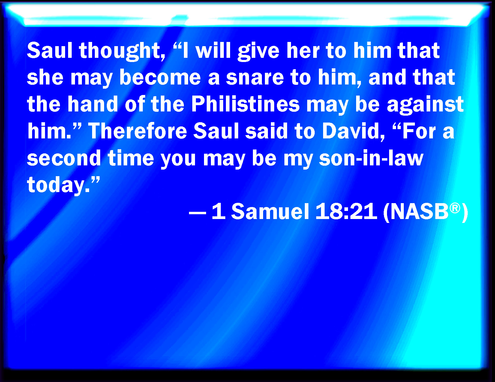 Bible Verse Slide 1 Samuel 18:21 And Saul said, I will give him her, that she may be a snare to him, and that the hand of the Philistines may be against him. Why Saul said to David, You shall this day be my son in law in the one of the two. KJV: And Saul said, I will give him her, that she may be a snare to him, and that the hand of the Philistines may be against him. Wherefore Saul said to David, Thou shalt this day be my son in law in the one of the twain. DRB: And Saul said: I will give her to him, that she may be a stumblingblock to him, and that the band of the Philistines may be upon him. And Saul said to David: In two things thou shalt be my son in law this day. DBT: And Saul said, I will give him her, that she may be a snare to him, and that the hand of the Philistines may be upon him. And Saul said to David, Thou shalt this day be my son-in-law a second time. ERV: And Saul said, I will give him her, that she may be a snare to him, and that the hand of the Philistines may be against him. Wherefore Saul said to David, Thou shalt this day be my son in law a second time. WBT: And Saul said, I will give her to him, that she may be a snare to him, and that the hand of the Philistines may be against him. Wherefore Saul said to David, Thou shalt this day be my son-in-law, in the one of the two. WEB: Saul said, I will give her to him, that she may be a snare to him, and that the hand of the Philistines may be against him. Therefore Saul said to David, "You shall this day be my son-in-law a second time." YLT: and Saul saith, 'I give her to him, and she is to him for a snare, and the hand of the Philistines is on him;' and Saul saith unto David, 'By the second — thou dost become my son-in-law to-day.'Links 1 Samuel 18:21 NIV • 1 Samuel 18:21 NLT • 1 Samuel 18:21 ESV • 1 Samuel 18:21 NASB • 1 Samuel 18:21 KJV • 1 Samuel 18:21 Interlinear • 1 Samuel 18:21 Commentaries • 1 Samuel 18:21 Parallel Texts • 1 Samuel 18:21 Bible Apps • 1 Samuel 18:21 Parallel • Bible Hub |