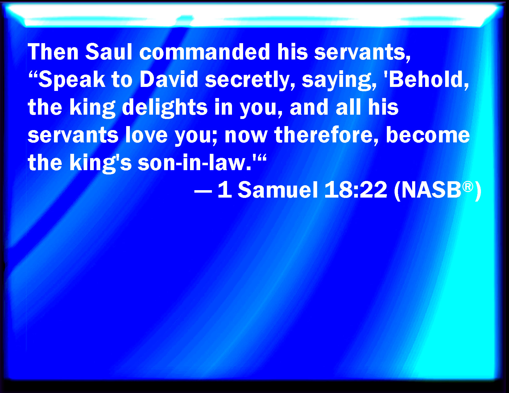 Bible Verse Slide 1 Samuel 18:22 And Saul commanded his servants, saying, Commune with David secretly, and say, Behold, the king has delight in you, and all his servants love you: now therefore be the king's son in law. KJV: And Saul commanded his servants, saying, Commune with David secretly, and say, Behold, the king hath delight in thee, and all his servants love thee: now therefore be the king's son in law. DRB: And Saul commanded his servants to speak to David privately, saying: Behold thou pleasest the king, and all his servants love thee. Now therefore be the king's son in law. DBT: And Saul commanded his servants, Speak with David secretly, saying, Behold, the king has delight in thee, and all his servants love thee: now therefore be the king's son-in-law. ERV: And Saul commanded his servants, saying, Commune with David secretly, and say, Behold, the king hath delight in thee, and all his servants love thee: now therefore be the king's son in law. WBT: And Saul commanded his servants, saying, Commune with David secretly, and say, Behold, the king hath delight in thee, and all his servants love thee: now therefore be the king's son-in-law. WEB: Saul commanded his servants, "Talk with David secretly, and say, 'Behold, the king has delight in you, and all his servants love you: now therefore be the king's son-in-law.'" YLT: And Saul commandeth his servants, 'Speak unto David gently, saying, Lo, the king hath delighted in thee, and all his servants have loved thee, and now, be son-in-law to the king.'Links 1 Samuel 18:22 NIV • 1 Samuel 18:22 NLT • 1 Samuel 18:22 ESV • 1 Samuel 18:22 NASB • 1 Samuel 18:22 KJV • 1 Samuel 18:22 Interlinear • 1 Samuel 18:22 Commentaries • 1 Samuel 18:22 Parallel Texts • 1 Samuel 18:22 Bible Apps • 1 Samuel 18:22 Parallel • Bible Hub |