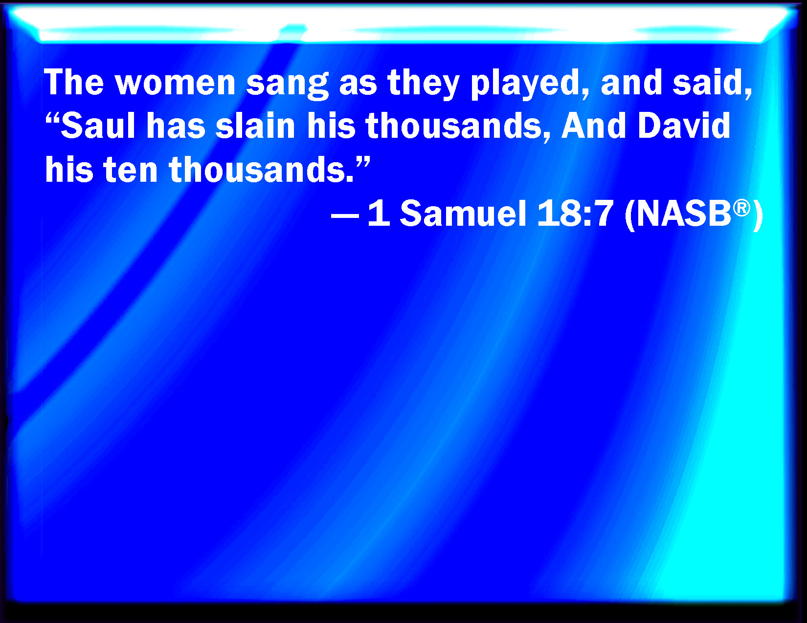 Bible Verse Slide 1 Samuel 18:7 And the women answered one another as they played, and said, Saul has slain his thousands, and David his ten thousands. KJV: And the women answered one another as they played, and said, Saul hath slain his thousands, and David his ten thousands. DRB: And the women sung as they played, and they said: Saul slew his thousands, and David his ten thousands. DBT: And the women answered one another as they played, and said, Saul hath smitten his thousands, And David his ten thousands. ERV: And the women sang one to another in their play, and said, Saul hath slain his thousands, and David his ten thousands. WBT: And the women answered one another as they played, and said, Saul hath slain his thousands, and David his ten thousands. WEB: The women sang one to another as they played, and said, "Saul has slain his thousands, David his ten thousands." YLT: and the women answer — those playing, and say, 'Saul hath smitten among his thousands, And David among his myriads.'Links 1 Samuel 18:7 NIV • 1 Samuel 18:7 NLT • 1 Samuel 18:7 ESV • 1 Samuel 18:7 NASB • 1 Samuel 18:7 KJV • 1 Samuel 18:7 Interlinear • 1 Samuel 18:7 Commentaries • 1 Samuel 18:7 Parallel Texts • 1 Samuel 18:7 Bible Apps • 1 Samuel 18:7 Parallel • Bible Hub |