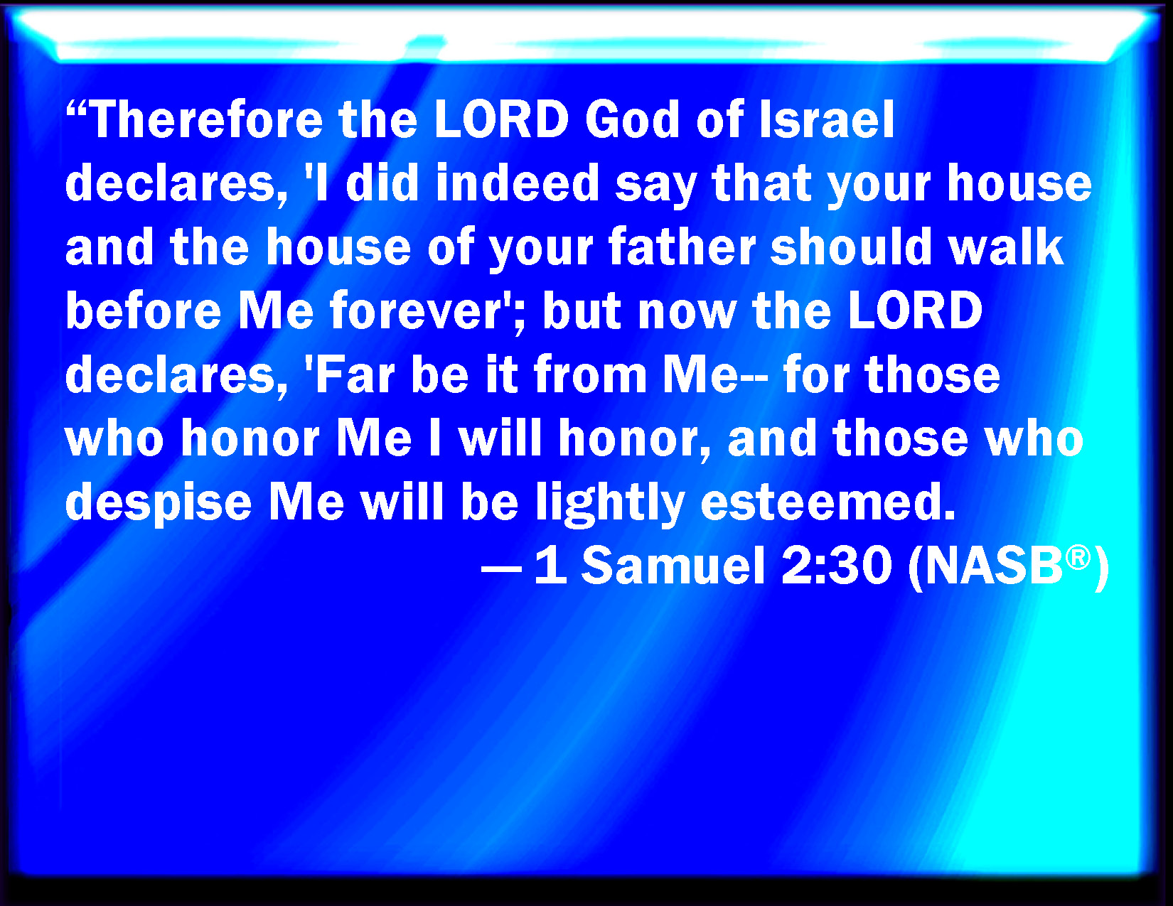 Bible Verse Slide 1 Samuel 2:30 Why the LORD God of Israel said, I said indeed that your house, and the house of your father, should walk before me for ever: but now the LORD said, Be it far from me; for them that honor me I will honor, and they that despise me shall be lightly esteemed. KJV: Wherefore the LORD God of Israel saith, I said indeed that thy house, and the house of thy father, should walk before me for ever: but now the LORD saith, Be it far from me; for them that honour me I will honour, and they that despise me shall be lightly esteemed. DRB: Wherefore thus saith the Lord the God of Israel: I said indeed that thy house, and the house of thy father should minister in my sight, for ever. But now saith the Lord: Far be this from me: but whosoever shall glorify me, him will I glorify: but they that despise me, shall be despised. DBT: Wherefore Jehovah the God of Israel saith, I said indeed, Thy house and the house of thy father should walk before me for ever. But now Jehovah saith, Be it far from me; for them that honour me I will honour, and they that despise me shall be lightly esteemed. ERV: Therefore the LORD, the God of Israel, saith, I said indeed that thy house, and the house of thy father, should walk before me for ever: but now the LORD saith, Be it far from me; for them that honour me I will honour, and they that despise me shall be lightly esteemed. WBT: Wherefore the LORD God of Israel saith, I said indeed that thy house, and the house of thy father should walk before me for ever: but now the LORD saith, Be it far from me; for them that honor me I will honor, and they that despise me shall be lightly esteemed. WEB: "Therefore Yahweh, the God of Israel, says, 'I said indeed that your house, and the house of your father, should walk before me forever.' But now Yahweh says, 'Be it far from me; for those who honor me I will honor, and those who despise me shall be lightly esteemed. YLT: Therefore — the affirmation of Jehovah, God of Israel — I certainly said, Thy house and the house of thy father, do walk up and down before Me to the age; and now — the affirmation of Jehovah — Far be it from Me! for he who is honouring Me, I honour, and those despising Me, are lightly esteemed.Links 1 Samuel 2:30 NIV • 1 Samuel 2:30 NLT • 1 Samuel 2:30 ESV • 1 Samuel 2:30 NASB • 1 Samuel 2:30 KJV • 1 Samuel 2:30 Interlinear • 1 Samuel 2:30 Commentaries • 1 Samuel 2:30 Parallel Texts • 1 Samuel 2:30 Bible Apps • 1 Samuel 2:30 Parallel • Bible Hub |