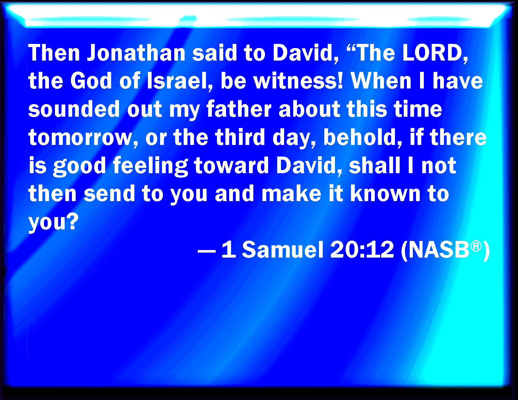 Bible Verse Slide 1 Samuel 20:12 And Jonathan said to David, O LORD God of Israel, when I have sounded my father about to morrow any time, or the third day, and, behold, if there be good toward David, and I then send not to you, and show it you; KJV: And Jonathan said unto David, O LORD God of Israel, when I have sounded my father about to morrow any time, or the third day, and, behold, if there be good toward David, and I then send not unto thee, and shew it thee; DRB: Jonathan said to David: O Lord God of Israel, if I shall discover my father's mind, to morrow or the day after, and there be any thing good for David, and I send not immediately to thee, and make it known to thee, DBT: And Jonathan said to David, Jehovah, God of Israel, when I sound my father about this time to-morrow, or the next day, and behold, there be good toward David, and I then send not to thee, and apprise thee of it, ERV: And Jonathan said unto David, The LORD, the God of Israel, be witness; when I have sounded my father about this time tomorrow, or the third day, behold, if there be good toward David, shall I not then send unto thee, and disclose it unto thee? WBT: And Jonathan said to David, O LORD God of Israel, when I have sounded my father about to-morrow any time, or the third day, and behold, if there be good towards David, and I then send not to thee, and show it thee; WEB: Jonathan said to David, "Yahweh, the God of Israel, [be witness]: when I have sounded my father about this time tomorrow, [or] the third day, behold, if there be good toward David, shall I not then send to you, and disclose it to you? YLT: And Jonathan saith unto David, 'Jehovah, God of Israel — when I search my father, about this time to-morrow or the third day, and lo, good is towards David, and I do not then send unto thee, and have uncovered thine ear — Links 1 Samuel 20:12 NIV • 1 Samuel 20:12 NLT • 1 Samuel 20:12 ESV • 1 Samuel 20:12 NASB • 1 Samuel 20:12 KJV • 1 Samuel 20:12 Interlinear • 1 Samuel 20:12 Commentaries • 1 Samuel 20:12 Parallel Texts • 1 Samuel 20:12 Bible Apps • 1 Samuel 20:12 Parallel • Bible Hub |