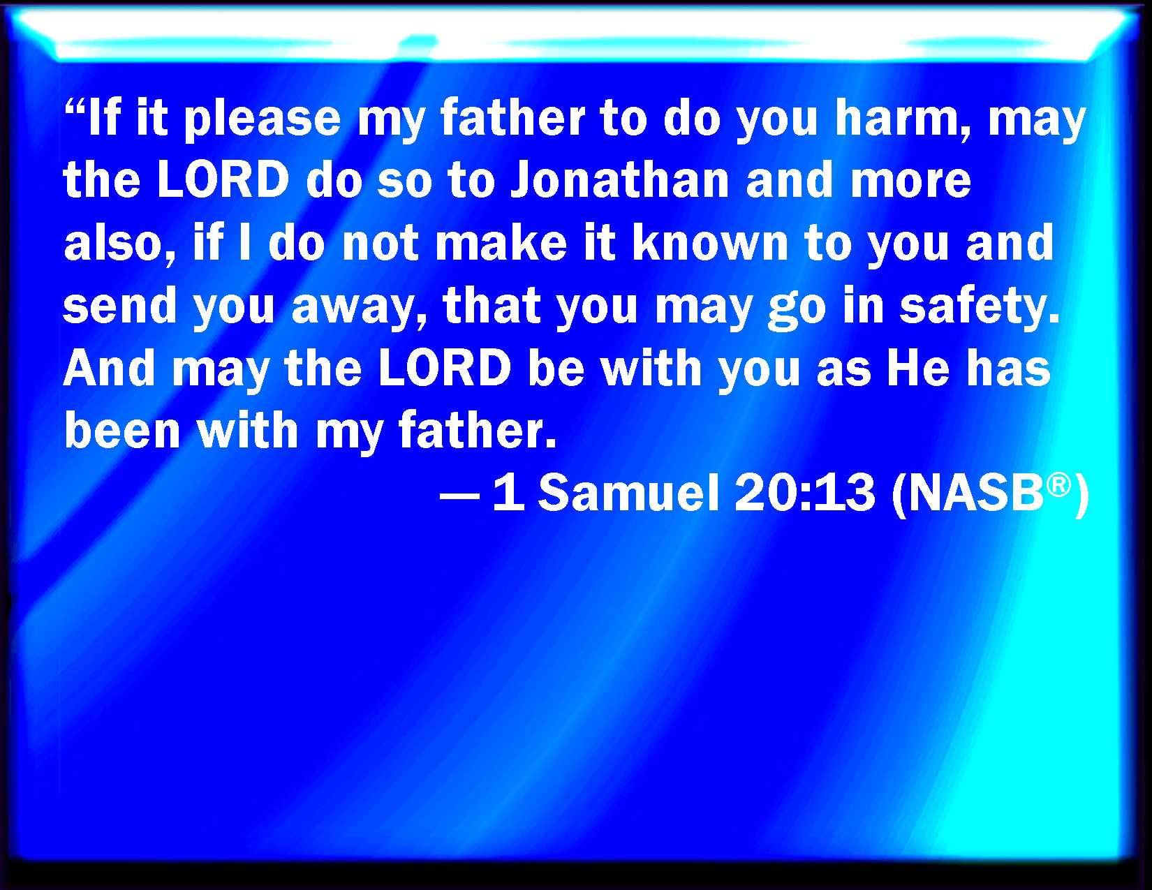 Bible Verse Slide 1 Samuel 20:13 The LORD do so and much more to Jonathan: but if it please my father to do you evil, then I will show it you, and send you away, that you may go in peace: and the LORD be with you, as he has been with my father. KJV: The LORD do so and much more to Jonathan: but if it please my father to do thee evil, then I will shew it thee, and send thee away, that thou mayest go in peace: and the LORD be with thee, as he hath been with my father. DRB: May the Lord do so and so to Jonathan and add still more. But if my father shall continue in malice against thee, I will discover it to thy ear, and will send thee away, that thou mayest go in peace, and the Lord be with thee, as he hath been with my father. DBT: Jehovah do so and much more to Jonathan. Should it please my father to do thee evil, then I will apprise thee of it, and send thee away, that thou mayest go in peace; and Jehovah be with thee, as he has been with my father. ERV: The LORD do so to Jonathan, and more also, should it please my father to do thee evil, if I disclose it not unto thee, and send thee away, that thou mayest go in peace: and the LORD be with thee, as he hath been with my father. WBT: The LORD do so and much more to Jonathan: but if it shall please my father to do thee evil, then I will show it to thee, and send thee away, that thou mayest go in peace: and the LORD be with thee, as he hath been with my father. WEB: Yahweh do so to Jonathan, and more also, should it please my father to do you evil, if I don't disclose it to you, and send you away, that you may go in peace: and Yahweh be with you, as he has been with my father. YLT: thus doth Jehovah do to Jonathan, and thus doth He add; when the evil concerning thee is good to my father, then I have uncovered thine ear, and sent thee away, and thou hast gone in peace, and Jehovah is with thee, as he was with my father;Links 1 Samuel 20:13 NIV • 1 Samuel 20:13 NLT • 1 Samuel 20:13 ESV • 1 Samuel 20:13 NASB • 1 Samuel 20:13 KJV • 1 Samuel 20:13 Interlinear • 1 Samuel 20:13 Commentaries • 1 Samuel 20:13 Parallel Texts • 1 Samuel 20:13 Bible Apps • 1 Samuel 20:13 Parallel • Bible Hub |