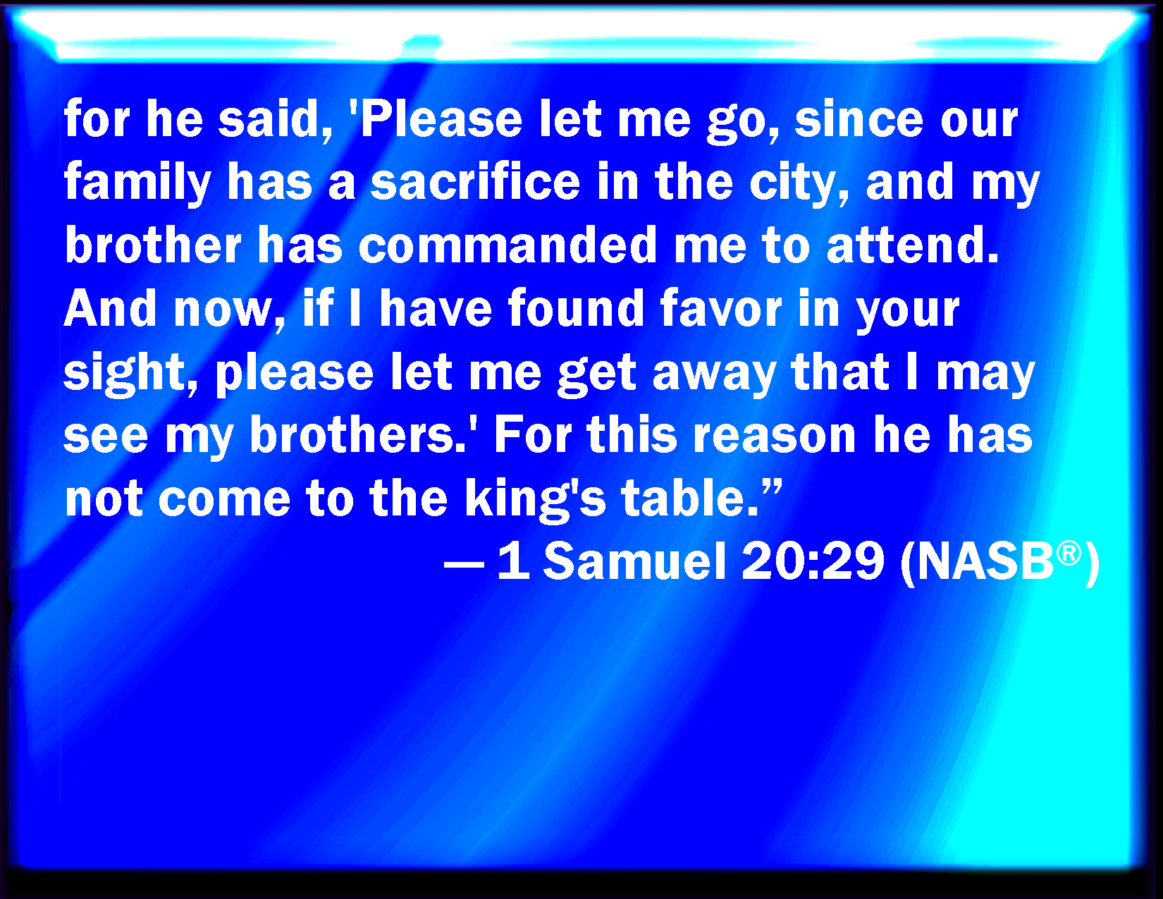 Bible Verse Slide 1 Samuel 20:29 And he said, Let me go, I pray you; for our family has a sacrifice in the city; and my brother, he has commanded me to be there: and now, if I have found favor in your eyes, let me get away, I pray you, and see my brothers. Therefore he comes not to the king's table. KJV: And he said, Let me go, I pray thee; for our family hath a sacrifice in the city; and my brother, he hath commanded me to be there: and now, if I have found favour in thine eyes, let me get away, I pray thee, and see my brethren. Therefore he cometh not unto the king's table. DRB: And he said: Let me go, for there is a solemn sacrifice in the city, one of my brethren hath sent for me: and now if I have found favour in thy eyes, I will go quickly, and see my brethren. For this cause he came not to the king's table. DBT: and said, Let me go, I pray thee; for we have a family sacrifice in the city; and my brother himself has commanded me to be there; and now, if I have found favour in thy sight, let me go away, I pray thee, and see my brethren. He has therefore not come to the king's table. ERV: and he said, Let me go, I pray thee; for our family hath a sacrifice in the city; and my brother, he hath commanded me to be there: and now, if I have found favour in thine eyes, let me get away, I pray thee, and see my brethren. Therefore he is not come unto the king's table. WBT: And he said, Let me go, I pray thee; for our family hath a sacrifice in the city; and my brother he hath commanded me to be there: and now if I have found favor in thy eyes, let me get away, I pray thee, and see my brethren. Therefore he cometh not to the king's table. WEB: He said, 'Please let me go, for our family has a sacrifice in the city. My brother has commanded me to be there. Now, if I have found favor in your eyes, please let me go away and see my brothers.' Therefore he has not come to the king's table." YLT: and he saith, Send me away, I pray thee, for a family sacrifice we have in the city, and my brother himself hath given command to me, and now, if I have found grace in thine eyes, let me go away, I pray thee, and see my brethren; therefore he hath not come unto the table of the king.'Links 1 Samuel 20:29 NIV • 1 Samuel 20:29 NLT • 1 Samuel 20:29 ESV • 1 Samuel 20:29 NASB • 1 Samuel 20:29 KJV • 1 Samuel 20:29 Interlinear • 1 Samuel 20:29 Commentaries • 1 Samuel 20:29 Parallel Texts • 1 Samuel 20:29 Bible Apps • 1 Samuel 20:29 Parallel • Bible Hub |