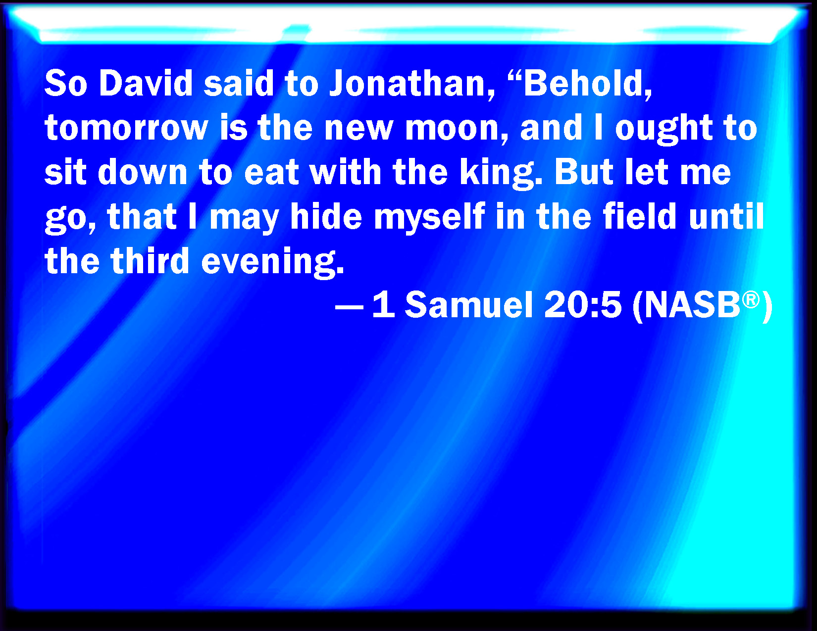 Bible Verse Slide 1 Samuel 20:5 And David said to Jonathan, Behold, to morrow is the new moon, and I should not fail to sit with the king at meat: but let me go, that I may hide myself in the field to the third day at even. KJV: And David said unto Jonathan, Behold, to morrow is the new moon, and I should not fail to sit with the king at meat: but let me go, that I may hide myself in the field unto the third day at even. DRB: And David said to Jonathan: Behold to morrow is the new moon, and I according to custom am wont to sit beside the king to eat: let me go then that I may be hid in the field till the evening of the third day. DBT: And David said to Jonathan, Behold, to-morrow is new moon, and I should not fail to sit with the king at meat; but let me go, that I may hide myself in the field until the third evening. ERV: And David said unto Jonathan, Behold, tomorrow is the new moon, and I should not fail to sit with the king at meat: but let me go, that I may hide myself in the field unto the third day at even. WBT: And David said to Jonathan, Behold, to morrow is the new-moon, and I should not fail to sit with the king at meat: but let me go, that I may hide myself in the field to the third day at evening. WEB: David said to Jonathan, "Behold, tomorrow is the new moon, and I should not fail to dine with the king; but let me go, that I may hide myself in the field to the third day at evening. YLT: And David saith unto Jonathan, 'Lo, the new moon is to-morrow; and I do certainly sit with the king to eat; and thou hast sent me away, and I have been hidden in a field till the third evening;Links 1 Samuel 20:5 NIV • 1 Samuel 20:5 NLT • 1 Samuel 20:5 ESV • 1 Samuel 20:5 NASB • 1 Samuel 20:5 KJV • 1 Samuel 20:5 Interlinear • 1 Samuel 20:5 Commentaries • 1 Samuel 20:5 Parallel Texts • 1 Samuel 20:5 Bible Apps • 1 Samuel 20:5 Parallel • Bible Hub |