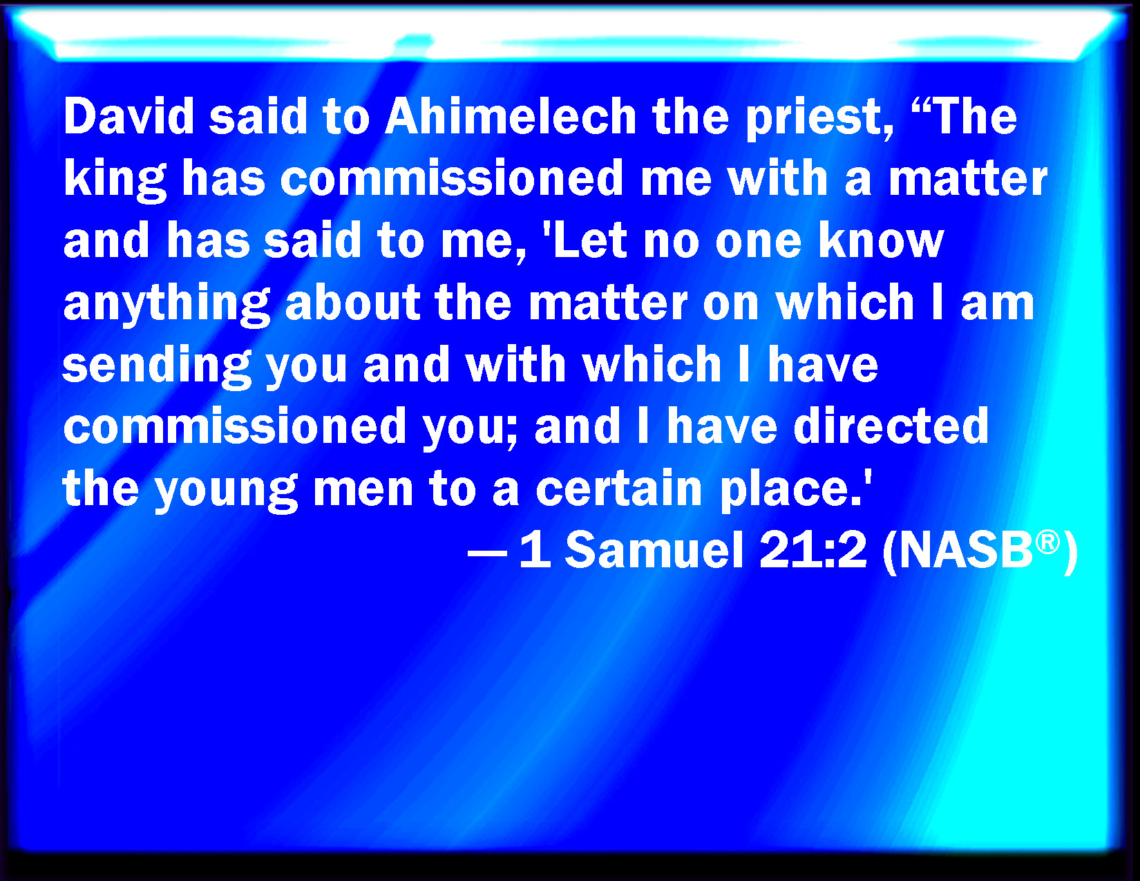 Bible Verse Slide 1 Samuel 21:2 And David said to Ahimelech the priest, The king has commanded me a business, and has said to me, Let no man know any thing of the business about which I send you, and what I have commanded you: and I have appointed my servants to such and such a place. KJV: And David said unto Ahimelech the priest, The king hath commanded me a business, and hath said unto me, Let no man know any thing of the business whereabout I send thee, and what I have commanded thee: and I have appointed my servants to such and such a place. DRB: And David said to Achimelech the priest: The king hath commanded me a business, and said: Let no man know the thing for which thou art sent by me, and what manner of commands I have given thee: and I have appointed my servants to such and such a place. DBT: And David said to Ahimelech the priest, The king has commanded me a business, and has said to me, Let no man know anything of the business whereon I send thee, and what I have commanded thee; and I have directed the young men to such and such a place. ERV: And David said unto Ahimelech the priest, The king hath commanded me a business, and hath said unto me, Let no man know any thing of the business whereabout I send thee, and what I have commanded thee: and I have appointed the young men to such and such a place. WBT: And David said to Ahimelech the priest, The king hath commanded me a business, and hath said to me, Let no man know any thing of the business about which I send thee, and what I have commanded thee: and I have appointed my servants to such and such a place. WEB: David said to Ahimelech the priest, "The king has commanded me a business, and has said to me, 'Let no man know anything of the business about which I send you, and what I have commanded you; and I have appointed the young men to such and such a place.' YLT: And David saith to Ahimelech the priest, 'The king hath commanded me a matter, and he saith unto me, Let no man know anything of the matter about which I am sending thee, and which I have commanded thee; and the young men I have caused to know at such and such a place;Links 1 Samuel 21:2 NIV • 1 Samuel 21:2 NLT • 1 Samuel 21:2 ESV • 1 Samuel 21:2 NASB • 1 Samuel 21:2 KJV • 1 Samuel 21:2 Interlinear • 1 Samuel 21:2 Commentaries • 1 Samuel 21:2 Parallel Texts • 1 Samuel 21:2 Bible Apps • 1 Samuel 21:2 Parallel • Bible Hub |