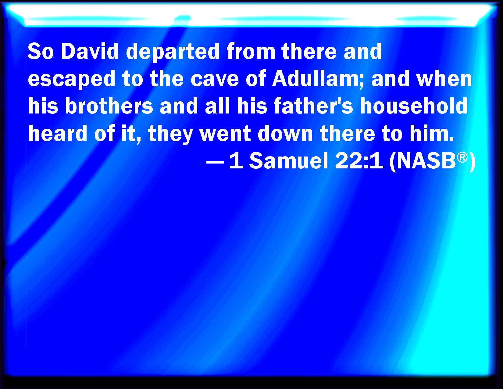 Bible Verse Slide 1 Samuel 22:1 David therefore departed there, and escaped to the cave Adullam: and when his brothers and all his father's house heard it, they went down thither to him. KJV: David therefore departed thence, and escaped to the cave Adullam: and when his brethren and all his father's house heard it, they went down thither to him. DRB: David therefore went from thence and fled to the cave of Odollam. And when his brethren, and all his father's house had heard of it, they went down to him thither; DBT: And David departed thence, and escaped to the cave of Adullam. And his brethren and all his father's house heard it, and they went down thither to him. ERV: David therefore departed thence, and escaped to the cave of Adullam: and when his brethren and all his father's house heard it, they went down thither to him. WBT: David therefore departed thence, and escaped to the cave Adullam: and when his brethren and all his father's house heard it, they went down thither to him. WEB: David therefore departed there, and escaped to the cave of Adullam. When his brothers and all his father's house heard it, they went down there to him. YLT: And David goeth thence, and is escaped unto the cave of Adullam, and his brethren hear, and all the house of his father, and go down unto him thither;Links 1 Samuel 22:1 NIV • 1 Samuel 22:1 NLT • 1 Samuel 22:1 ESV • 1 Samuel 22:1 NASB • 1 Samuel 22:1 KJV • 1 Samuel 22:1 Interlinear • 1 Samuel 22:1 Commentaries • 1 Samuel 22:1 Parallel Texts • 1 Samuel 22:1 Bible Apps • 1 Samuel 22:1 Parallel • Bible Hub |