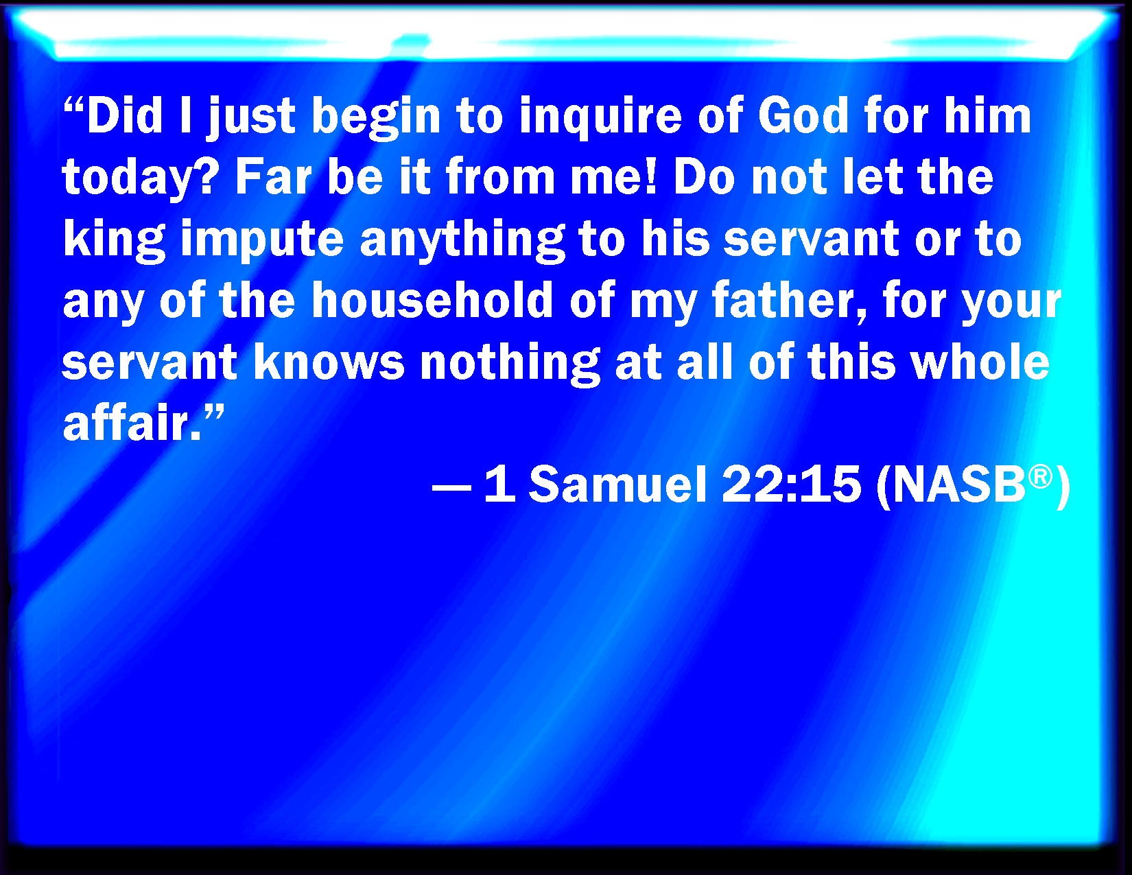 Bible Verse Slide 1 Samuel 22:15 Did I then begin to inquire of God for him? be it far from me: let not the king impute any thing to his servant, nor to all the house of my father: for your servant knew nothing of all this, less or more. KJV: Did I then begin to inquire of God for him? be it far from me: let not the king impute any thing unto his servant, nor to all the house of my father: for thy servant knew nothing of all this, less or more. DRB: Did I begin to day to consult the Lord for him? far be this from me: let not the king suspect such a thing against his servant, or any one in all my father's house: for thy servant knew nothing of this matter, either little or great. DBT: Was it to-day that I began to inquire of God for him? be it far from me: let not the king charge anything to his servant, nor to all the house of my father; for thy servant knew nothing of all this, less or more. ERV: Have I today begun to inquire of God for him? be it far from me: let not the king impute any thing unto his servant, nor to all the house of my father: for thy servant knoweth nothing of all this, less or more. WBT: Did I then begin to inquire of God for him? be it far from me. Let not the king impute any thing to his servant, nor to all the house of my father: for thy servant knew nothing of all this, less or more. WEB: Have I today begun to inquire of God for him? Be it far from me! Don't let the king impute anything to his servant, nor to all the house of my father; for your servant knows nothing of all this, less or more." YLT: To-day have I begun to ask for him at God? far be it from me! let not the king lay anything against his servant, against any of the house of my father, for thy servant hath known nothing of all this, less or more.'Links 1 Samuel 22:15 NIV • 1 Samuel 22:15 NLT • 1 Samuel 22:15 ESV • 1 Samuel 22:15 NASB • 1 Samuel 22:15 KJV • 1 Samuel 22:15 Interlinear • 1 Samuel 22:15 Commentaries • 1 Samuel 22:15 Parallel Texts • 1 Samuel 22:15 Bible Apps • 1 Samuel 22:15 Parallel • Bible Hub |