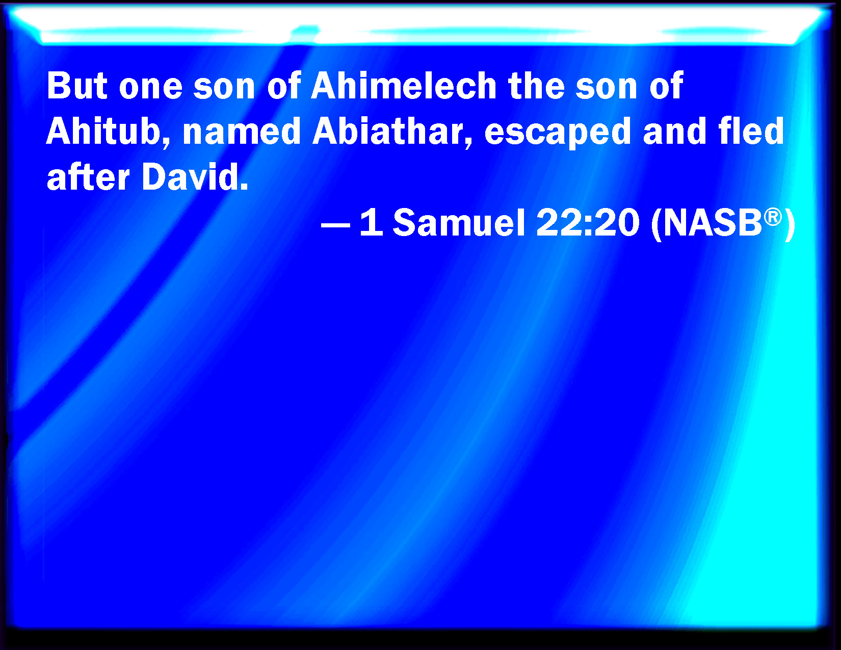 Bible Verse Slide 1 Samuel 22:20 And one of the sons of Ahimelech the son of Ahitub, named Abiathar, escaped, and fled after David. KJV: And one of the sons of Ahimelech the son of Ahitub, named Abiathar, escaped, and fled after David. DRB: But one of the sons of Achimelech the son of Achitob, whose name was Abiathar, escaped, and fled to David, DBT: And one of the sons of Ahimelech the son of Ahitub, named Abiathar, escaped, and fled after David. ERV: And one of the sons of Ahimelech the son of Ahitub, named Abiathar, escaped, and fled after David. WBT: And one of the sons of Ahimelech the son of Ahitub, named Abiathar, escaped, and fled after David. WEB: One of the sons of Ahimelech, the son of Ahitub, named Abiathar, escaped, and fled after David. YLT: And there escapeth one son of Ahimelech, son of Ahitub, and his name is Abiathar, and he fleeth after David,Links 1 Samuel 22:20 NIV • 1 Samuel 22:20 NLT • 1 Samuel 22:20 ESV • 1 Samuel 22:20 NASB • 1 Samuel 22:20 KJV • 1 Samuel 22:20 Interlinear • 1 Samuel 22:20 Commentaries • 1 Samuel 22:20 Parallel Texts • 1 Samuel 22:20 Bible Apps • 1 Samuel 22:20 Parallel • Bible Hub |