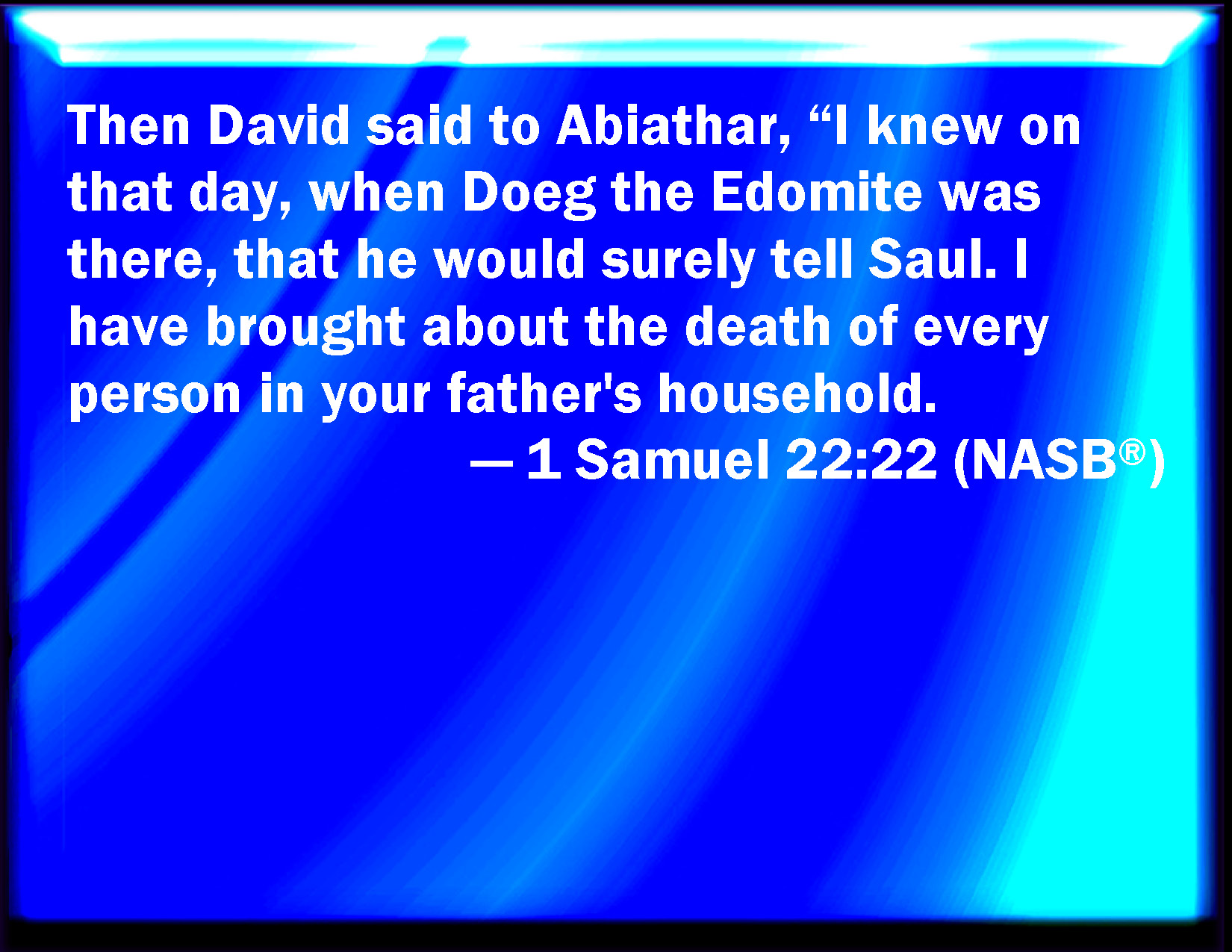Bible Verse Slide 1 Samuel 22:22 And David said to Abiathar, I knew it that day, when Doeg the Edomite was there, that he would surely tell Saul: I have occasioned the death of all the persons of your father's house. KJV: And David said unto Abiathar, I knew it that day, when Doeg the Edomite was there, that he would surely tell Saul: I have occasioned the death of all the persons of thy father's house. DRB: And David said to Abiathar: I knew that day when Doeg the Edomite was there, that without doubt he would tell Saul: I have been the occasion of the death of all the souls of thy father's house. DBT: And David said to Abiathar, I knew it that day, when Doeg the Edomite was there, that he would certainly tell Saul: I am accountable for all the lives of thy father's house. ERV: And David said unto Abiathar, I knew on that day, when Doeg the Edomite was there, that he would surely tell Saul: I have occasioned the death of all the persons of thy father's house. WBT: And David said to Abiathar, I knew that day, when Doeg the Edomite was there, that he would surely tell Saul: I have occasioned the death of all the persons of thy father's house. WEB: David said to Abiathar, "I knew on that day, when Doeg the Edomite was there, that he would surely tell Saul. I am responsible for the death of all the persons of your father's house. YLT: And David saith to Abiathar, 'I have known on that day when Doeg the Edomite is there, that he doth certainly declare it to Saul; I have brought it round to every person of the house of thy father;Links 1 Samuel 22:22 NIV • 1 Samuel 22:22 NLT • 1 Samuel 22:22 ESV • 1 Samuel 22:22 NASB • 1 Samuel 22:22 KJV • 1 Samuel 22:22 Interlinear • 1 Samuel 22:22 Commentaries • 1 Samuel 22:22 Parallel Texts • 1 Samuel 22:22 Bible Apps • 1 Samuel 22:22 Parallel • Bible Hub |