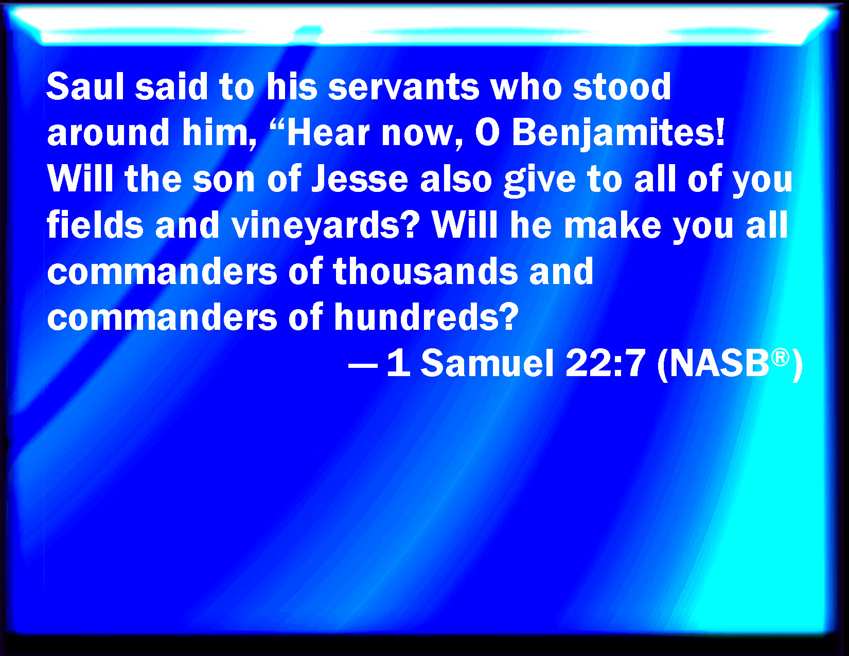 Bible Verse Slide 1 Samuel 22:7 Then Saul said to his servants that stood about him, Hear now, you Benjamites; will the son of Jesse give every one of you fields and vineyards, and make you all captains of thousands, and captains of hundreds; KJV: Then Saul said unto his servants that stood about him, Hear now, ye Benjamites; will the son of Jesse give every one of you fields and vineyards, and make you all captains of thousands, and captains of hundreds; DRB: He said to his servants that stood about him: Hear me now, ye sons of Jemini: will the son of Isai give everyone of you fields, and vineyards, and make you all tribunes, and centurions: DBT: Then Saul said to his servants that stood by him, Hear now, ye Benjaminites: will the son of Jesse give every one of you also fields and vineyards? Will he make you all captains of thousands and captains of hundreds, ERV: And Saul said unto his servants that stood about him, Hear now, ye Benjamites; will the son of Jesse give every one of you fields and vineyards, will he make you all captains of thousands and captains of hundreds; WBT: Then Saul said to his servants that stood about him, Hear now, ye Benjaminites; will the son of Jesse give every one of you fields and vineyards, and make you all captains of thousands, and captains of hundreds; WEB: Saul said to his servants who stood about him, "Hear now, you Benjamites! Will the son of Jesse give everyone of you fields and vineyards, will he make you all captains of thousands and captains of hundreds, YLT: And Saul saith to his servants who are standing by him, 'Hear, I pray you, ye Benjamites; also to all of you doth the son of Jesse give fields and vineyards! all of you he doth appoint heads of thousands and heads of hundreds!Links 1 Samuel 22:7 NIV • 1 Samuel 22:7 NLT • 1 Samuel 22:7 ESV • 1 Samuel 22:7 NASB • 1 Samuel 22:7 KJV • 1 Samuel 22:7 Interlinear • 1 Samuel 22:7 Commentaries • 1 Samuel 22:7 Parallel Texts • 1 Samuel 22:7 Bible Apps • 1 Samuel 22:7 Parallel • Bible Hub |