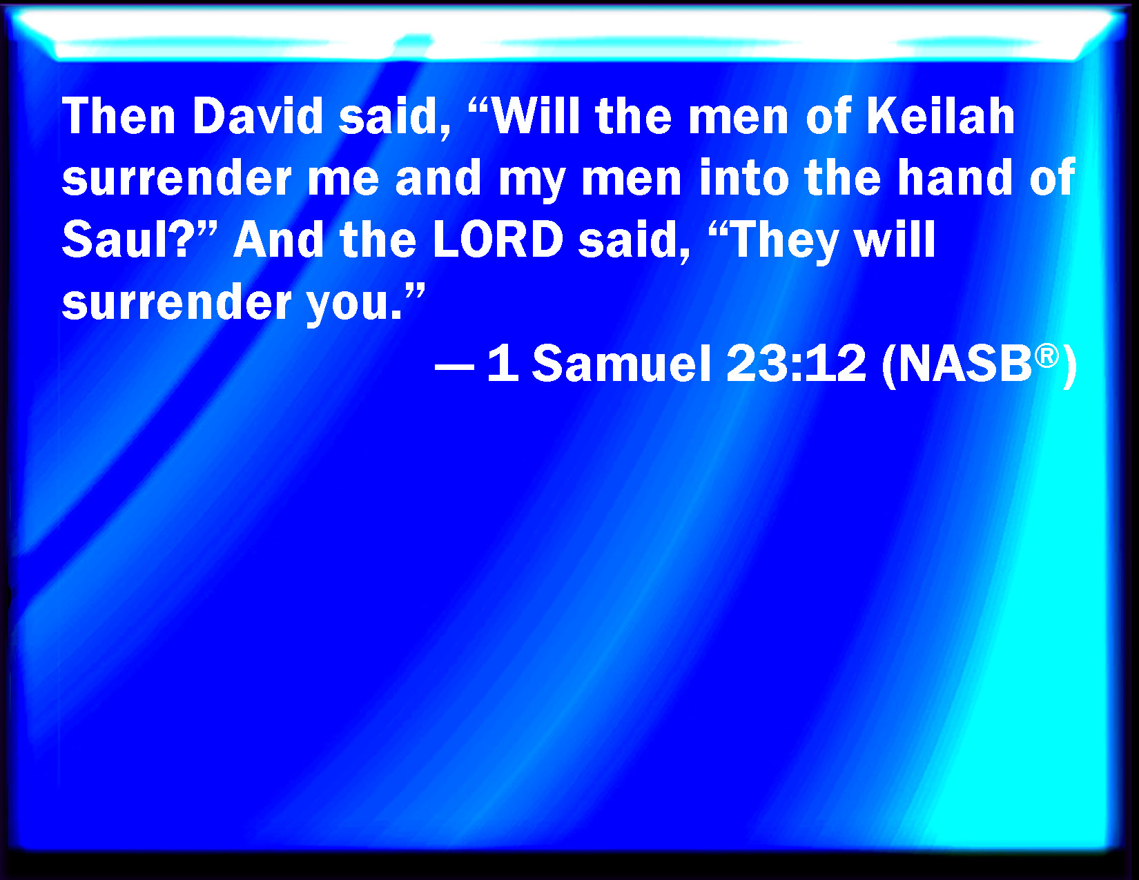 Bible Verse Slide 1 Samuel 23:12 Then said David, Will the men of Keilah deliver me and my men into the hand of Saul? And the LORD said, They will deliver you up. KJV: Then said David, Will the men of Keilah deliver me and my men into the hand of Saul? And the LORD said, They will deliver thee up. DRB: And David said: Will the men of Ceila deliver me, and my men, into the hands of Saul? And the Lord said: They will deliver thee up. DBT: And David said, Will the citizens of Keilah deliver up me and my men into the hand of Saul? And Jehovah said, They will deliver thee up. ERV: Then said David, Will the men of Keilah deliver up me and my men into the hand of Saul? And the LORD said, They will deliver thee up. WBT: Then said David, Will the men of Keilah deliver me and my men into the hand of Saul? And the LORD said, They will deliver thee up. WEB: Then David said, "Will the men of Keilah deliver me and my men into the hand of Saul?" Yahweh said, "They will deliver you up." YLT: And David saith, 'Do the possessors of Keilah shut me up, and my men, into the hand of Saul?' And Jehovah saith, 'They shut thee up.'Links 1 Samuel 23:12 NIV • 1 Samuel 23:12 NLT • 1 Samuel 23:12 ESV • 1 Samuel 23:12 NASB • 1 Samuel 23:12 KJV • 1 Samuel 23:12 Interlinear • 1 Samuel 23:12 Commentaries • 1 Samuel 23:12 Parallel Texts • 1 Samuel 23:12 Bible Apps • 1 Samuel 23:12 Parallel • Bible Hub |