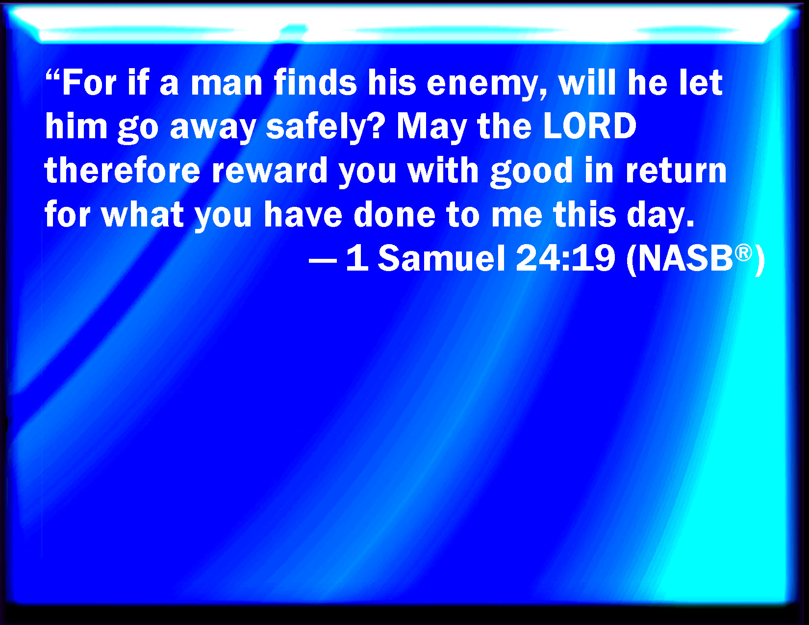 Bible Verse Slide 1 Samuel 24:19 For if a man find his enemy, will he let him go well away? why the LORD reward you good for that you have done to me this day. KJV: For if a man find his enemy, will he let him go well away? wherefore the LORD reward thee good for that thou hast done unto me this day. DRB: For who when he hath found his enemy, will let him go well away? But the Lord reward thee for this good turn, for what thou hast done to me this day. DBT: For if a man find his enemy, will he let him go well away? wherefore Jehovah reward thee good for that thou hast done to me this day. ERV: For if a man find his enemy, will he let him go well away? wherefore the LORD reward thee good for that thou hast done unto me this day. WBT: For if a man findeth his enemy, will he let him go away well? wherefore the LORD reward thee with good, for what thou hast done to me this day. WEB: For if a man finds his enemy, will he let him go away unharmed? Therefore may Yahweh reward you good for that which you have done to me this day. YLT: and that a man doth find his enemy, and hath sent him away in a good manner; and Jehovah doth repay thee good for that which thou didst to me this day.Links 1 Samuel 24:19 NIV • 1 Samuel 24:19 NLT • 1 Samuel 24:19 ESV • 1 Samuel 24:19 NASB • 1 Samuel 24:19 KJV • 1 Samuel 24:19 Interlinear • 1 Samuel 24:19 Commentaries • 1 Samuel 24:19 Parallel Texts • 1 Samuel 24:19 Bible Apps • 1 Samuel 24:19 Parallel • Bible Hub |