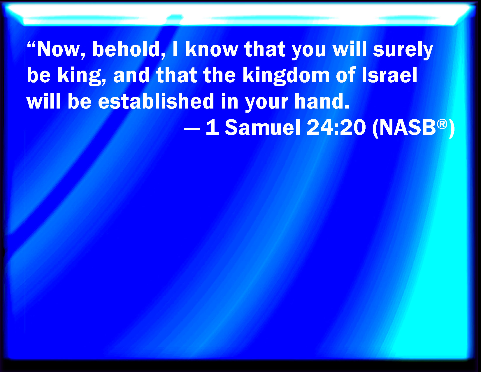Bible Verse Slide 1 Samuel 24:20 And now, behold, I know well that you shall surely be king, and that the kingdom of Israel shall be established in your hand. KJV: And now, behold, I know well that thou shalt surely be king, and that the kingdom of Israel shall be established in thine hand. DRB: And now as I know that thou shalt surely be king, and have the kingdom of Israel in thy hand: DBT: And now behold, I know that thou shalt certainly be king, and that the kingdom of Israel shall be established in thy hand. ERV: And now, behold, I know that thou shalt surely be king, and that the kingdom of Israel shall be established in thine hand. WBT: And now, behold, I know well that thou wilt surely be king, and that the kingdom of Israel will be established in thy hand. WEB: Now, behold, I know that you shall surely be king, and that the kingdom of Israel shall be established in your hand. YLT: 'And, now, lo, I have known that thou dost certainly reign, and the kingdom of Israel hath stood in thy hand;Links 1 Samuel 24:20 NIV • 1 Samuel 24:20 NLT • 1 Samuel 24:20 ESV • 1 Samuel 24:20 NASB • 1 Samuel 24:20 KJV • 1 Samuel 24:20 Interlinear • 1 Samuel 24:20 Commentaries • 1 Samuel 24:20 Parallel Texts • 1 Samuel 24:20 Bible Apps • 1 Samuel 24:20 Parallel • Bible Hub |