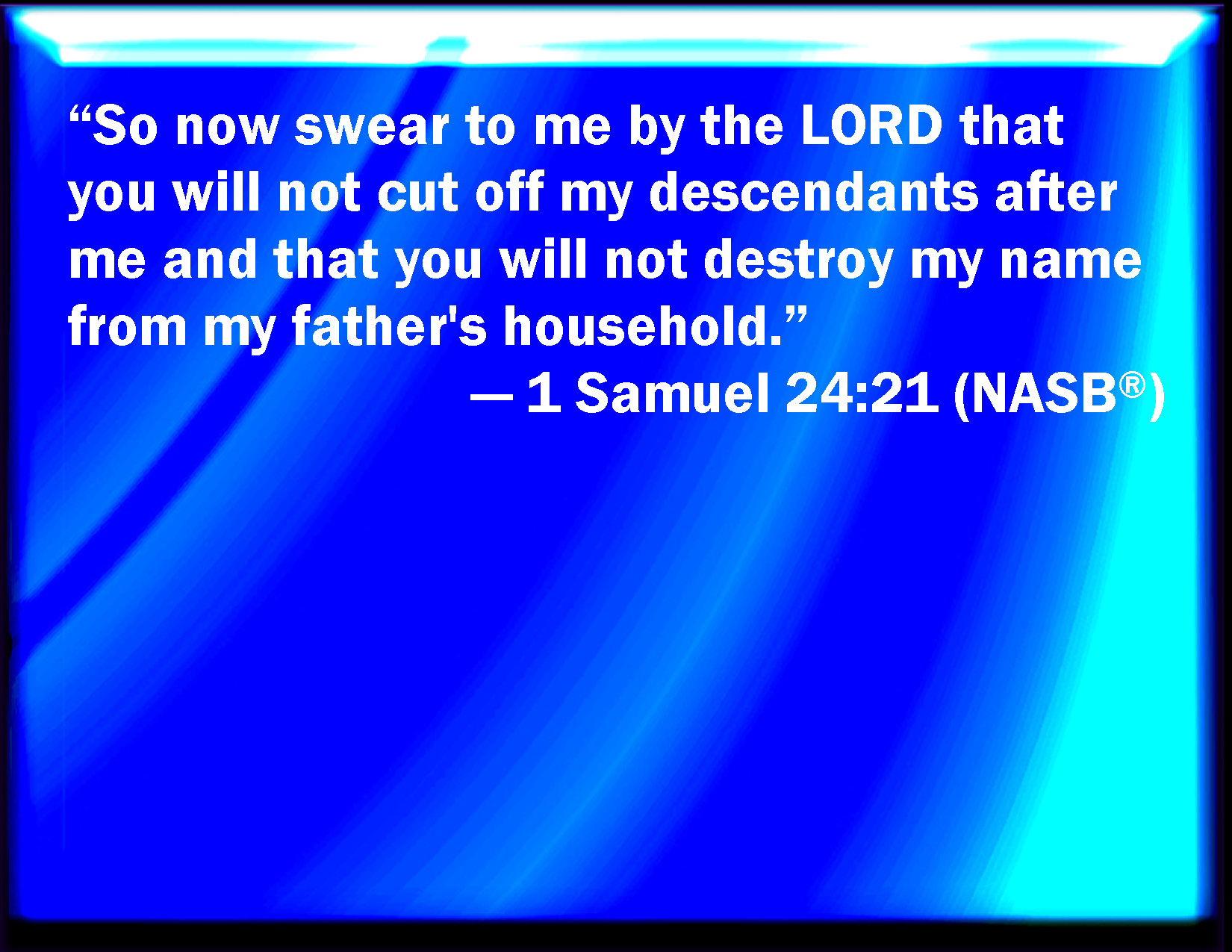 Bible Verse Slide 1 Samuel 24:21 Swear now therefore to me by the LORD, that you will not cut off my seed after me, and that you will not destroy my name out of my father's house. KJV: Swear now therefore unto me by the LORD, that thou wilt not cut off my seed after me, and that thou wilt not destroy my name out of my father's house. DRB: Swear to me by the Lord, that thou wilt not destroy my seed after me, nor take away my name from the house of my father. DBT: Swear now therefore to me by Jehovah, that thou wilt not cut off my seed after me, and that thou wilt not destroy my name out of my father's house. ERV: Swear now therefore unto me by the LORD, that thou wilt not cut off my seed after me, and that thou wilt not destroy my name out of my father's house. WBT: Swear now therefore to me by the LORD, that thou wilt not cut off my seed after me, and that thou wilt not destroy my name out of my father's house. WEB: Swear now therefore to me by Yahweh, that you will not cut off my seed after me, and that you will not destroy my name out of my father's house." YLT: and, now, swear to me by Jehovah — thou dost not cut off my seed after me, nor dost thou destroy my name from the house of my father.'Links 1 Samuel 24:21 NIV • 1 Samuel 24:21 NLT • 1 Samuel 24:21 ESV • 1 Samuel 24:21 NASB • 1 Samuel 24:21 KJV • 1 Samuel 24:21 Interlinear • 1 Samuel 24:21 Commentaries • 1 Samuel 24:21 Parallel Texts • 1 Samuel 24:21 Bible Apps • 1 Samuel 24:21 Parallel • Bible Hub |
