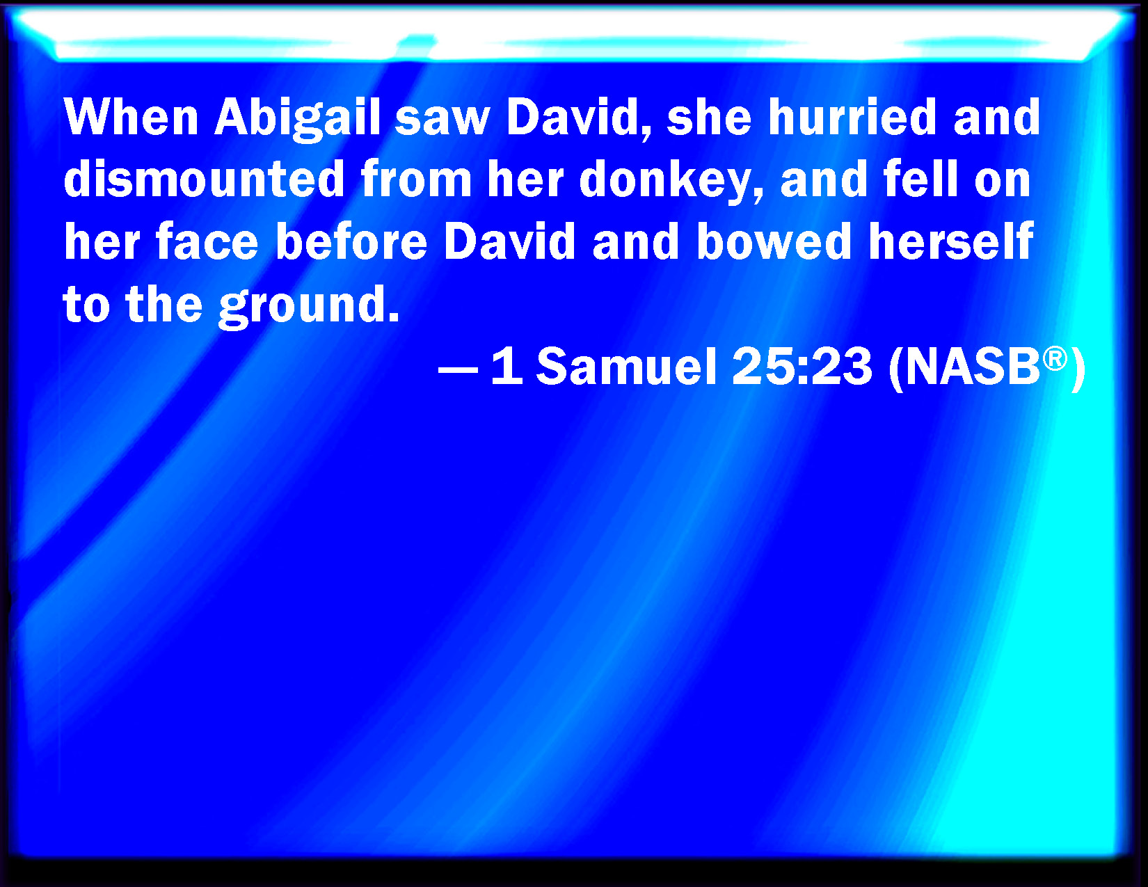 Bible Verse Slide 1 Samuel 25:23 And when Abigail saw David, she hurried, and lighted off the ass, and fell before David on her face, and bowed herself to the ground, KJV: And when Abigail saw David, she hasted, and lighted off the ass, and fell before David on her face, and bowed herself to the ground, DRB: And when Abigail saw David she made haste and lighted off the ass, and fell before David, on her face, and adored upon the ground. DBT: And when Abigail saw David, she hasted and lighted off the ass, and fell before David on her face, and bowed herself to the ground, ERV: And when Abigail saw David, she hasted, and lighted off her ass, and fell before David on her face, and bowed herself to the ground. WBT: And when Abigail saw David, she hasted, and lighted off the ass, and fell before David on her face, and bowed herself to the ground. WEB: When Abigail saw David, she hurried, and alighted from her donkey, and fell before David on her face, and bowed herself to the ground. YLT: And Abigail seeth David, and hasteth and cometh down from off the ass, and falleth before David on her face, and boweth herself to the earth,Links 1 Samuel 25:23 NIV • 1 Samuel 25:23 NLT • 1 Samuel 25:23 ESV • 1 Samuel 25:23 NASB • 1 Samuel 25:23 KJV • 1 Samuel 25:23 Interlinear • 1 Samuel 25:23 Commentaries • 1 Samuel 25:23 Parallel Texts • 1 Samuel 25:23 Bible Apps • 1 Samuel 25:23 Parallel • Bible Hub |