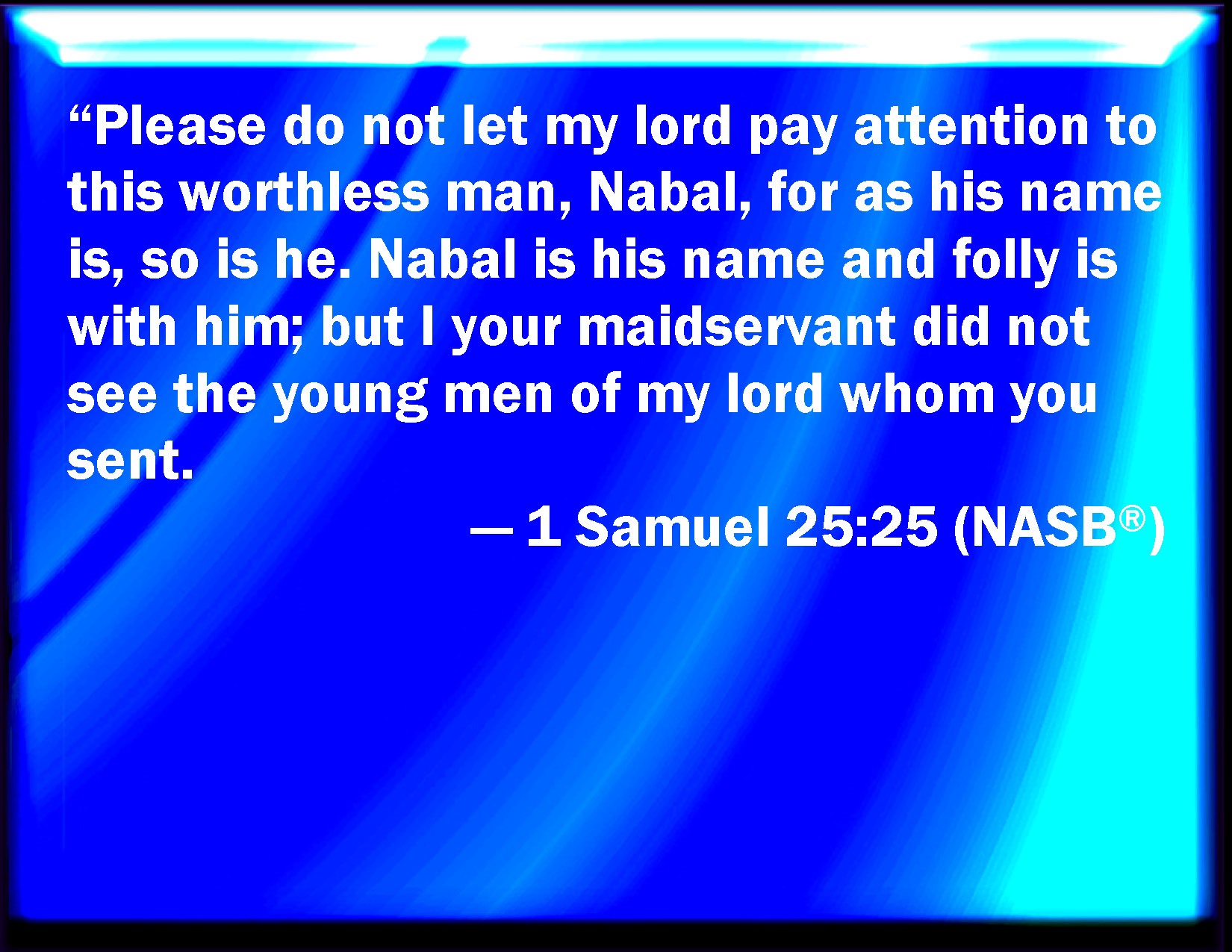 Bible Verse Slide 1 Samuel 25:25 Let not my lord, I pray you, regard this man of Belial, even Nabal: for as his name is, so is he; Nabal is his name, and folly is with him: but I your handmaid saw not the young men of my lord, whom you did send. KJV: Let not my lord, I pray thee, regard this man of Belial, even Nabal: for as his name is, so is he; Nabal is his name, and folly is with him: but I thine handmaid saw not the young men of my lord, whom thou didst send. DRB: Let not my lord the king, I pray, regard this naughty man Nabal: for according to his name, he is a fool, and folly is with him: but I thy handmaid did not see thy servants, my lord, whom thou sentest. DBT: Let not my lord, I pray thee, regard this man of Belial, Nabal; for as his name is, so is he: Nabal is his name, and folly is with him; and I thy handmaid did not see the young men of my lord, whom thou didst send. ERV: Let not my lord, I pray thee, regard this man of Belial, even Nabal: for as his name is, so is he; Nabal is his name, and folly is with him: hut I thine handmaid saw not the young men of my lord, whom thou didst send. WBT: Let not my lord, I pray thee, regard this man of Belial, even Nabal; for as his name is, so is he; Nabal is his name, and folly is with him: but I thy handmaid saw not the young men of my lord, whom thou didst send. WEB: Please don't let my lord regard this worthless fellow, even Nabal; for as his name is, so is he. Nabal is his name, and folly is with him; but I, your handmaid, didn't see the young men of my lord, whom you sent. YLT: Let not, I pray thee, my lord set his heart to this man of worthlessness, on Nabal, for as his name is so is he; Nabal is his name, and folly is with him; and I, thine handmaid, did not see the young men of my lord whom thou didst send;Links 1 Samuel 25:25 NIV • 1 Samuel 25:25 NLT • 1 Samuel 25:25 ESV • 1 Samuel 25:25 NASB • 1 Samuel 25:25 KJV • 1 Samuel 25:25 Interlinear • 1 Samuel 25:25 Commentaries • 1 Samuel 25:25 Parallel Texts • 1 Samuel 25:25 Bible Apps • 1 Samuel 25:25 Parallel • Bible Hub |