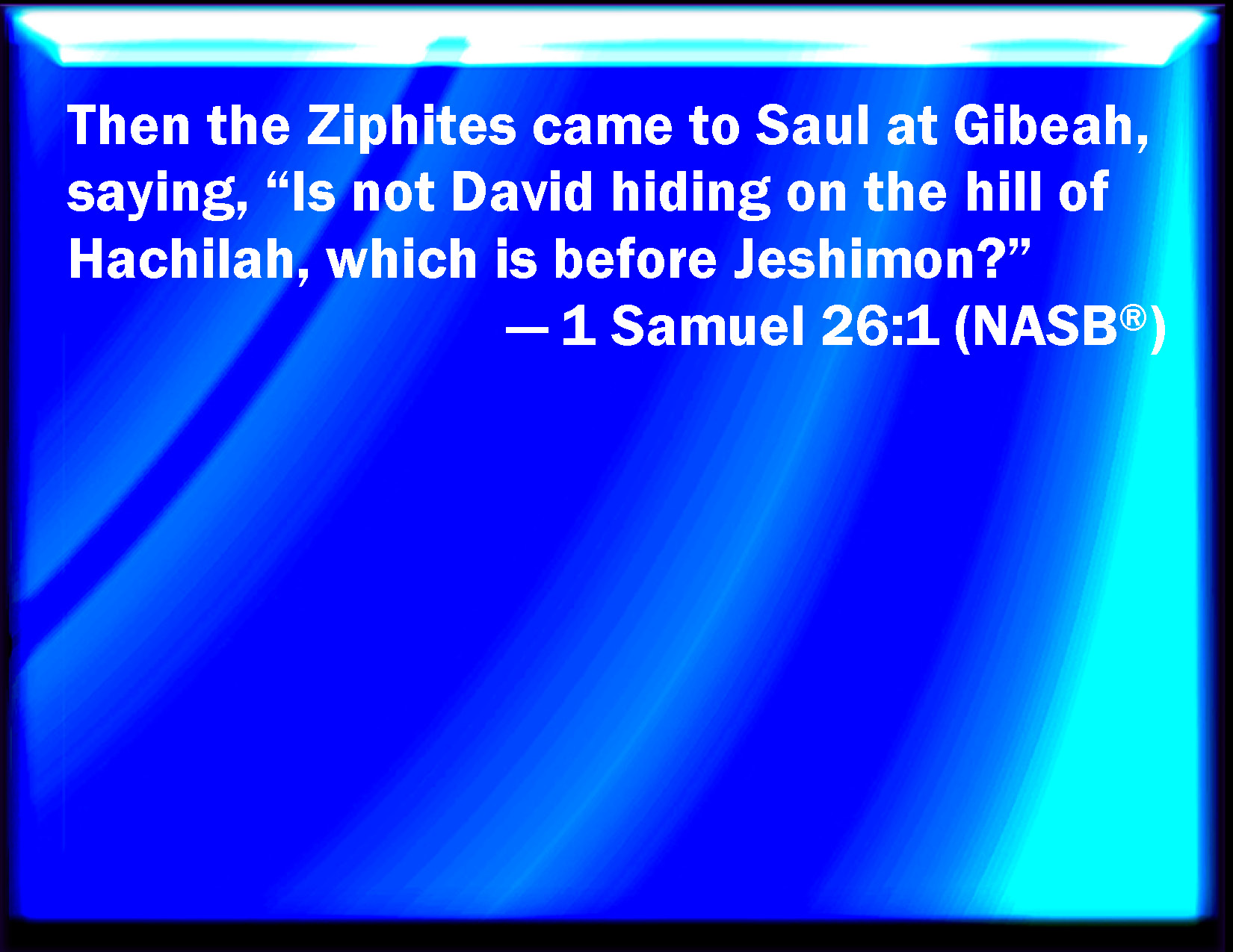 Bible Verse Slide 1 Samuel 26:1 And the Ziphites came to Saul to Gibeah, saying, Does not David hide himself in the hill of Hachilah, which is before Jeshimon? KJV: And the Ziphites came unto Saul to Gibeah, saying, Doth not David hide himself in the hill of Hachilah, which is before Jeshimon? DRB: And the men of Ziph came to Saul in Gabaa, saying: Behold David is hid in the hill of Hachila, which is over against the wilderness. DBT: And the Ziphites came to Saul to Gibeah, saying, Does not David hide himself in the hill of Hachilah, facing the waste? ERV: And the Ziphites came unto Saul to Gibeah, saying, Doth not David hide himself in the hill of Hachilah, which is before the desert? WBT: And the Ziphites came to Saul to Gibeah, saying, Doth not David hide himself in the hill of Hachilah, which is before Jeshimon? WEB: The Ziphites came to Saul to Gibeah, saying, "Doesn't David hide himself in the hill of Hachilah, which is before the desert?" YLT: And the Ziphites come in unto Saul, at Gibeah, saying, 'Is not David hiding himself in the height of Hachilah, on the front of the desert?'Links 1 Samuel 26:1 NIV • 1 Samuel 26:1 NLT • 1 Samuel 26:1 ESV • 1 Samuel 26:1 NASB • 1 Samuel 26:1 KJV • 1 Samuel 26:1 Interlinear • 1 Samuel 26:1 Commentaries • 1 Samuel 26:1 Parallel Texts • 1 Samuel 26:1 Bible Apps • 1 Samuel 26:1 Parallel • Bible Hub |