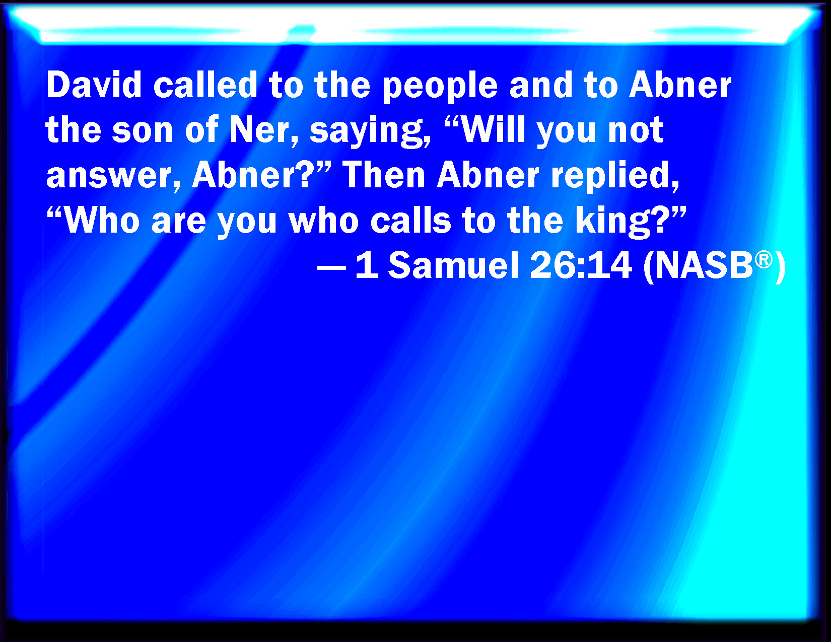 Bible Verse Slide 1 Samuel 26:14 And David cried to the people, and to Abner the son of Ner, saying, Answer you not, Abner? Then Abner answered and said, Who are you that cry to the king? KJV: And David cried to the people, and to Abner the son of Ner, saying, Answerest thou not, Abner? Then Abner answered and said, Who art thou that criest to the king? DRB: David cried to the people, and to Abner the son of Ner, saying: Wilt thou not answer, Abner? And Abner answering, said: Who art thou, that criest, and disturbest the king? DBT: And David cried to the people, and to Abner the son of Ner, saying, Answerest thou not, Abner? Then Abner answered and said, Who art thou that criest to the king? ERV: and David cried to the people, and to Abner the son of Ner, saving, Answerest thou not, Abner? Then Abner answered and said, Who art thou that criest to the king? WBT: And David cried to the people, and to Abner the son of Ner, saying, Answerest thou not, Abner? Then Abner answered and said, Who art thou that criest to the king? WEB: and David cried to the people, and to Abner the son of Ner, saying, "Don't you answer, Abner?" Then Abner answered, "Who are you who cries to the king?" YLT: and David calleth unto the people, and unto Abner son of Ner, saying, 'Dost thou not answer, Abner?' and Abner answereth and saith, 'Who art thou who hast called unto the king?'Links 1 Samuel 26:14 NIV • 1 Samuel 26:14 NLT • 1 Samuel 26:14 ESV • 1 Samuel 26:14 NASB • 1 Samuel 26:14 KJV • 1 Samuel 26:14 Interlinear • 1 Samuel 26:14 Commentaries • 1 Samuel 26:14 Parallel Texts • 1 Samuel 26:14 Bible Apps • 1 Samuel 26:14 Parallel • Bible Hub |