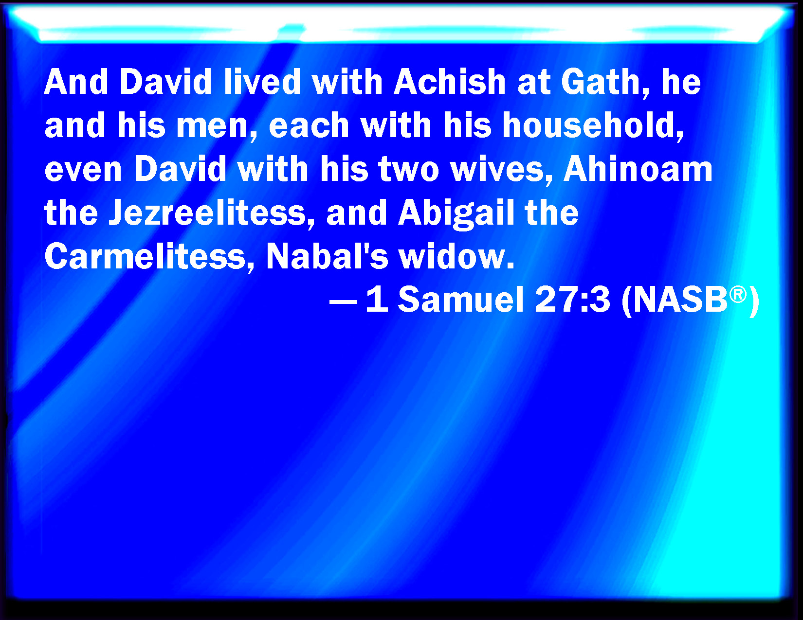 Bible Verse Slide 1 Samuel 27:3 And David dwelled with Achish at Gath, he and his men, every man with his household, even David with his two wives, Ahinoam the Jezreelitess, and Abigail the Carmelitess, Nabal's wife. KJV: And David dwelt with Achish at Gath, he and his men, every man with his household, even David with his two wives, Ahinoam the Jezreelitess, and Abigail the Carmelitess, Nabal's wife. DRB: And David dwelt with Achis at Geth, he and his men: every man with his household, and David with his two wives, Achinoam the Jezrahelitess, and Abigail the wife of Nabal of Carmel. DBT: And David abode with Achish at Gath, he and his men, every man with his household; David with his two wives, Ahinoam the Jizreelitess, and Abigail the Carmelitess, Nabal's wife. ERV: And David dwelt with Achish at Gath, he and his men, every man with his household, even David with his two wives, Ahinoam the Jezreelitess, and Abigail the Carmelitess, Nabal's wife. WBT: And David dwelt with Achish at Gath, he and his men, every man with his household, even David with his two wives, Ahinoam the Jezreelitess, and Abigail the Carmelitess Nabal's wife. WEB: David lived with Achish at Gath, he and his men, every man with his household, even David with his two wives, Ahinoam the Jezreelitess, and Abigail the Carmelitess, Nabal's wife. YLT: and David dwelleth with Achish in Gath, he and his men, each one with his household, even David and his two wives, Ahinoam the Jezreelitess, and Abigail wife of Nabal the Carmelitess.Links 1 Samuel 27:3 NIV • 1 Samuel 27:3 NLT • 1 Samuel 27:3 ESV • 1 Samuel 27:3 NASB • 1 Samuel 27:3 KJV • 1 Samuel 27:3 Interlinear • 1 Samuel 27:3 Commentaries • 1 Samuel 27:3 Parallel Texts • 1 Samuel 27:3 Bible Apps • 1 Samuel 27:3 Parallel • Bible Hub |