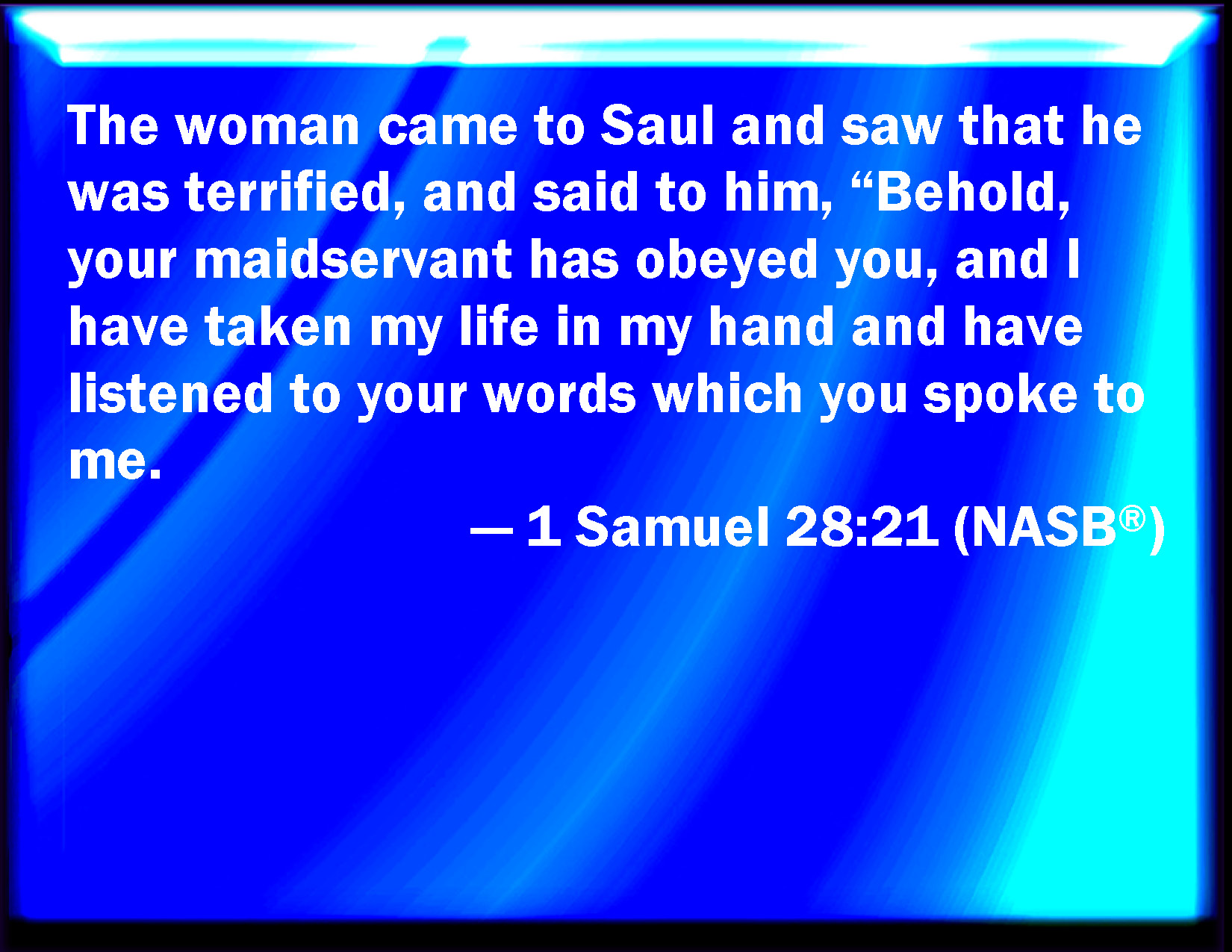 Bible Verse Slide 1 Samuel 28:21 And the woman came to Saul, and saw that he was sore troubled, and said to him, Behold, your handmaid has obeyed your voice, and I have put my life in my hand, and have listened to your words which you spoke to me. KJV: And the woman came unto Saul, and saw that he was sore troubled, and said unto him, Behold, thine handmaid hath obeyed thy voice, and I have put my life in my hand, and have hearkened unto thy words which thou spakest unto me. DRB: And the woman came to Saul (for he was very much troubled) and said to him: Behold thy handmaid hath obeyed thy voice, and I have put my life in my hand: and I hearkened unto the words which thou spokest to me. DBT: And the woman came to Saul, and saw that he was sore troubled, and said to him, Behold, thy bondmaid has hearkened to thy voice, and I have put my life in my hand, and have hearkened to thy words which thou spokest to me. ERV: And the woman came unto Saul, and saw that he was sore troubled, and said unto him, Behold, thine handmaid hath hearkened unto thy voice, and I have put my life in my hand, and have hearkened unto thy words which thou spakest unto me. WBT: And the woman came to Saul, and saw that he was greatly troubled, and said to him, Behold, thy handmaid hath obeyed thy voice, and I have put my life in my hand, and have hearkened to thy words, which thou didst speak WEB: The woman came to Saul, and saw that he was very troubled, and said to him, "Behold, your handmaid has listened to your voice, and I have put my life in my hand, and have listened to your words which you spoke to me. YLT: And the woman cometh in unto Saul, and seeth that he hath been greatly troubled, and saith unto him, 'Lo, thy maid-servant hath hearkened to thy voice, and I put my soul in my hand, and I obey thy words which thou hast spoken unto me;Links 1 Samuel 28:21 NIV • 1 Samuel 28:21 NLT • 1 Samuel 28:21 ESV • 1 Samuel 28:21 NASB • 1 Samuel 28:21 KJV • 1 Samuel 28:21 Interlinear • 1 Samuel 28:21 Commentaries • 1 Samuel 28:21 Parallel Texts • 1 Samuel 28:21 Bible Apps • 1 Samuel 28:21 Parallel • Bible Hub |
