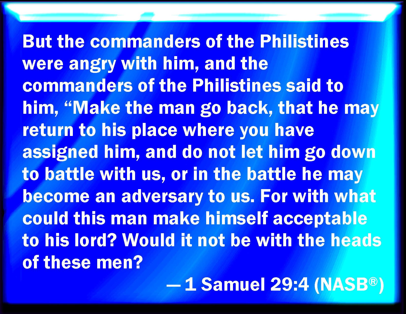 1 Samuel 29:4 And the princes of the Philistines were wroth with him; and the princes of the Philistines said to him, Make this fellow return, that he may go again to his place which you have appointed him, and let him not go down with us to battle, lest in the battle he be an adversary to us: for with which should he reconcile himself to his master? should it not be with the heads of these men?